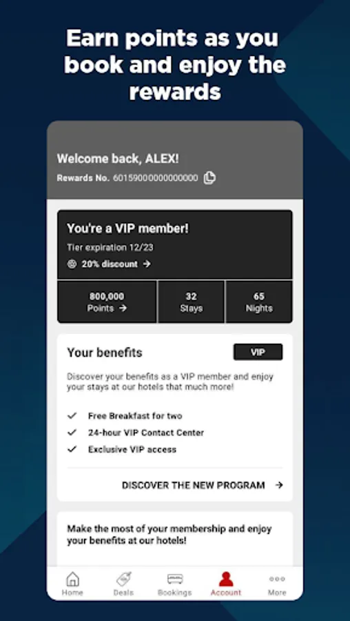 - Keep track of your membership status (tier progression, points balance, stay history)