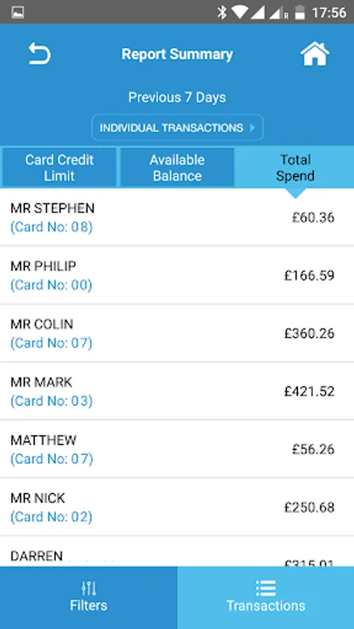 - Select filters or change date range on individual cards or groups as well as viewing all transactions on-screen to minimise fraudulent use and to manage lost or stolen cards