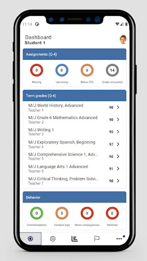 • Missing, Upcoming, Low Grade Assignments, Academic Summary, Conduct Log, Attendance