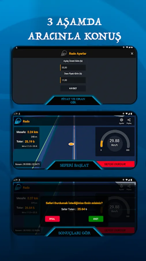 Rado is an application that you can use for FREE, receive your location information based on your movement, and instantly calculate your vehicle's fuel consumption or taximeter amount. and You can enter the opening fee and the rate price per km and you can see your location and speed on the map instantly.