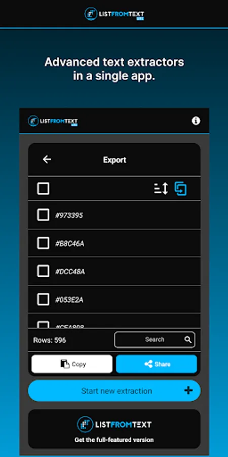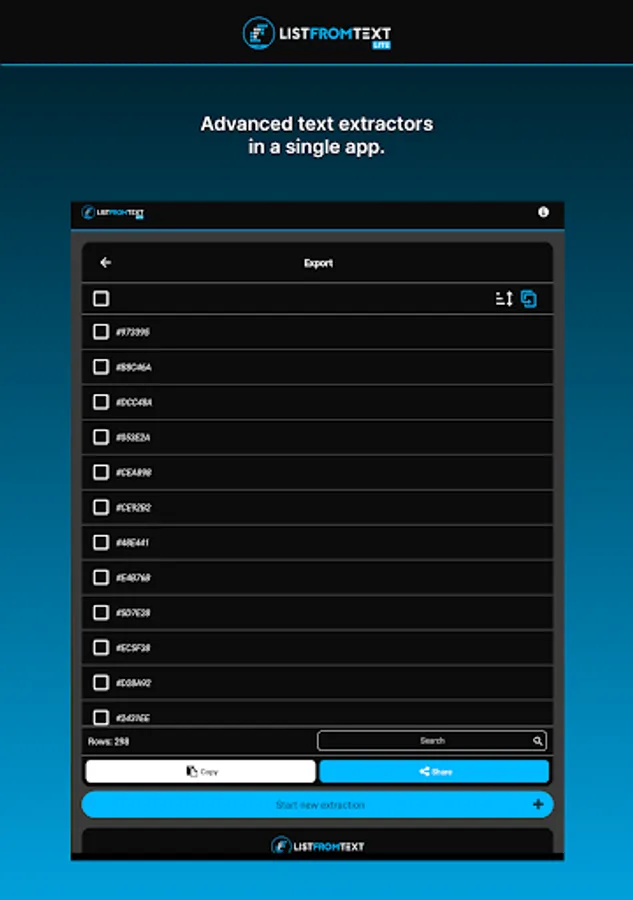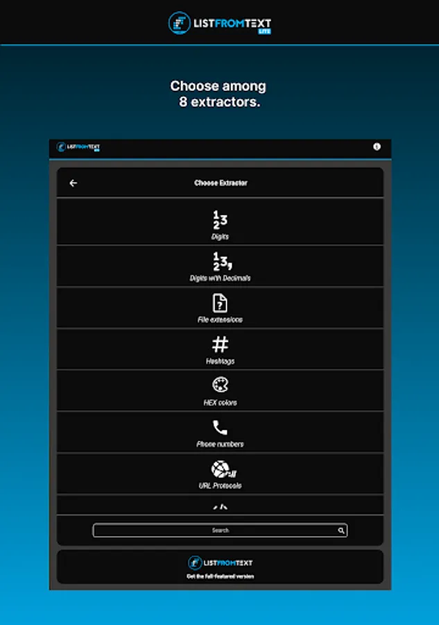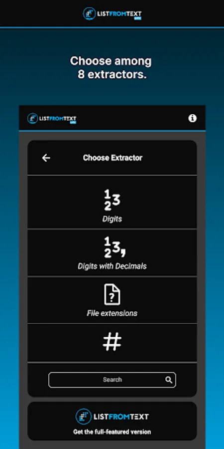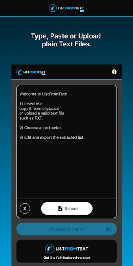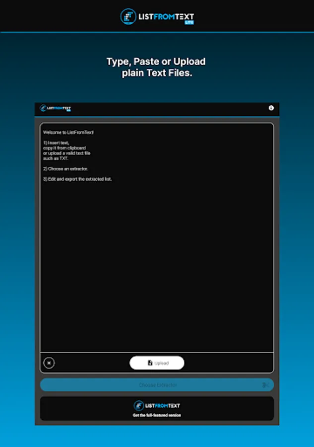 For more file upload formats and more extractors, get the full-featured ListFromText app.