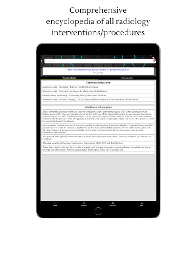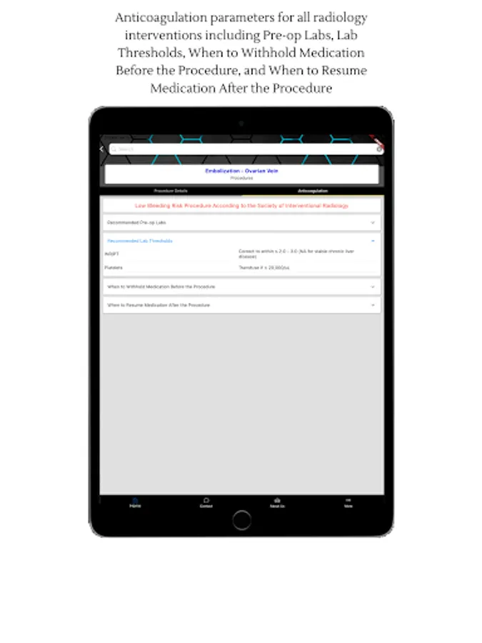 * Comprehensive encyclopedia of radiology procedures/interventions. Every interventional radiology procedure is listed with common indications and recommended anticoagulation parameters to safely perform the procedure. For example, Rads Consult will advise you on what minimum labs should be drawnprior to a TIPS procedure, what the INR and PTT have to be to safely perform the procedure, when to withhold Aspirin, Plavix, Coumadin, etc. and when to restart anticoagulation medication.