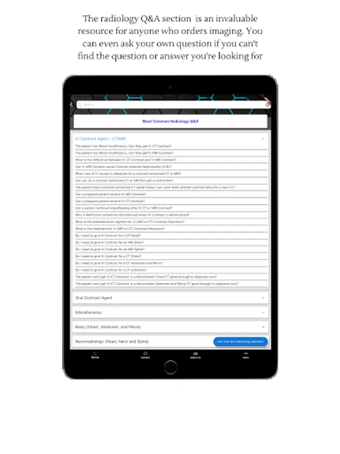 * If the Rads Consult app does not answer your radiology question, you can message one of our subspecialized radiologists and he or she will do their best to clarify an existing explanation in the app and/or answer your new question which is then added to the continually expanding Q&A section.