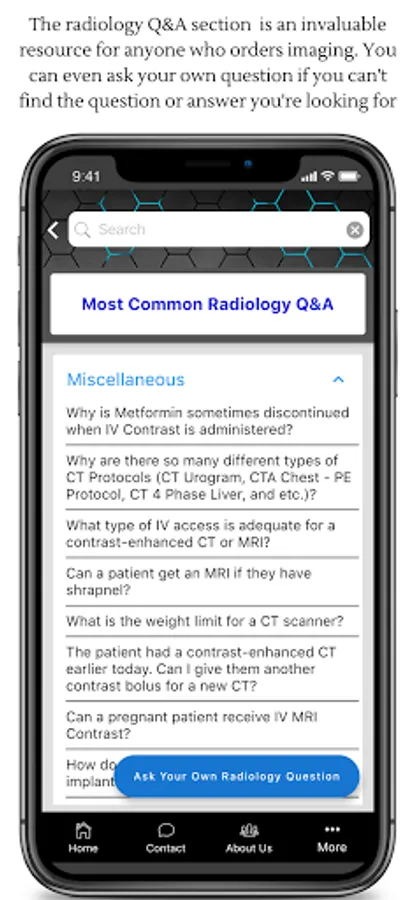 * Most Common Radiology Q&A section with practical recommendations on when IV and/or Oral Contrast is needed, how to image pregnant or breastfeeding patients, how to manage contrast reactions, how to image patients with renal insufficiency, minimum recommended IV access requirements to administer contrast for CT/CTA and MRI/MRA imaging, how to tell if a line or tube is appropriately positioned, etc.