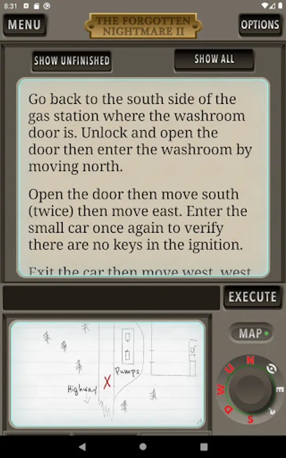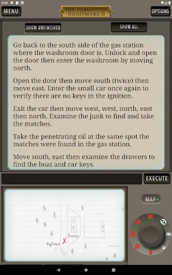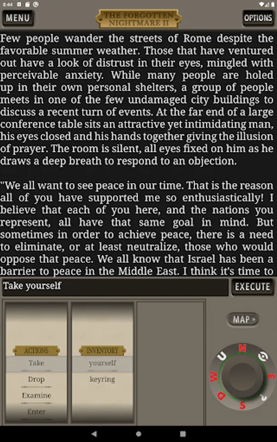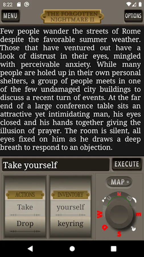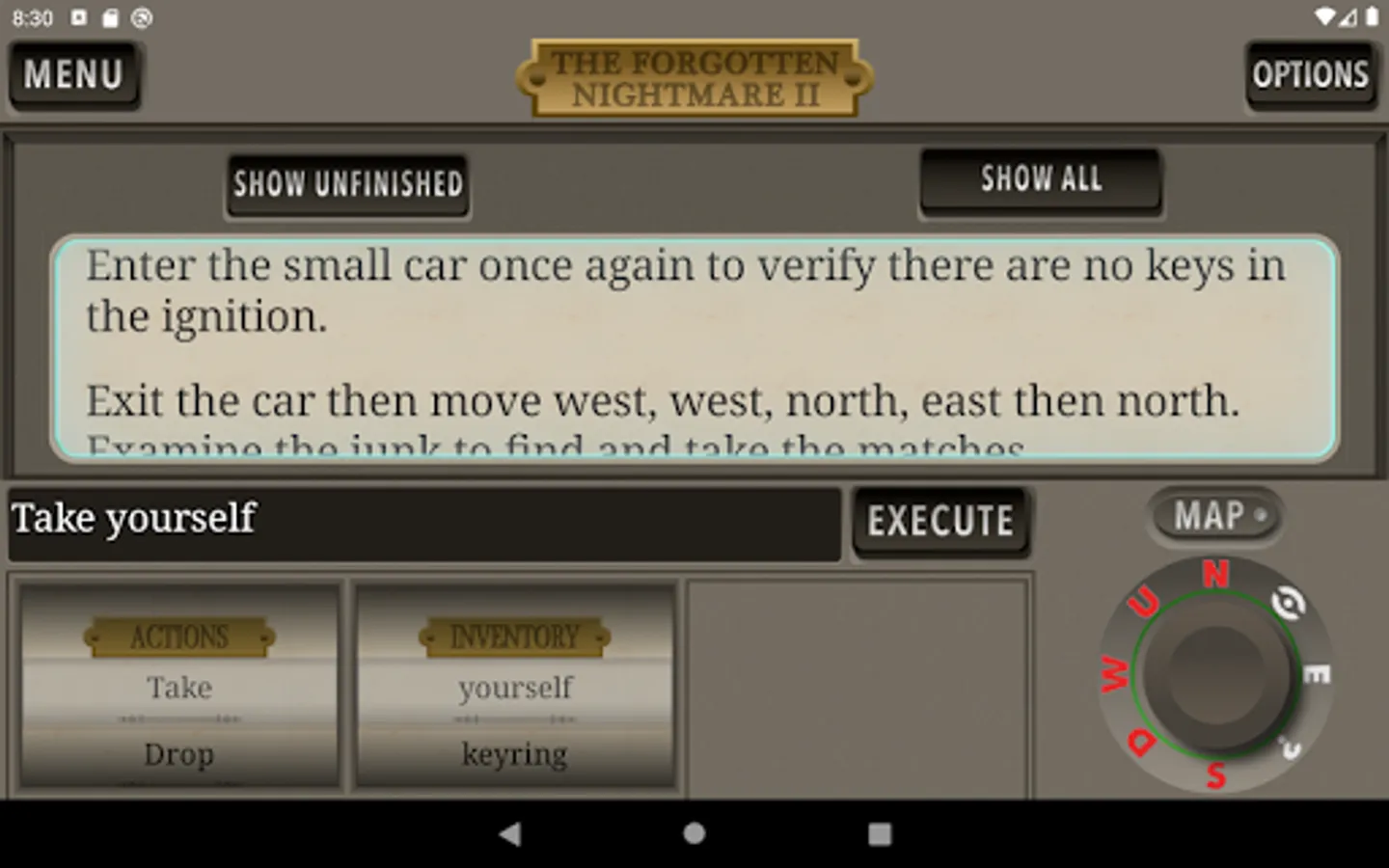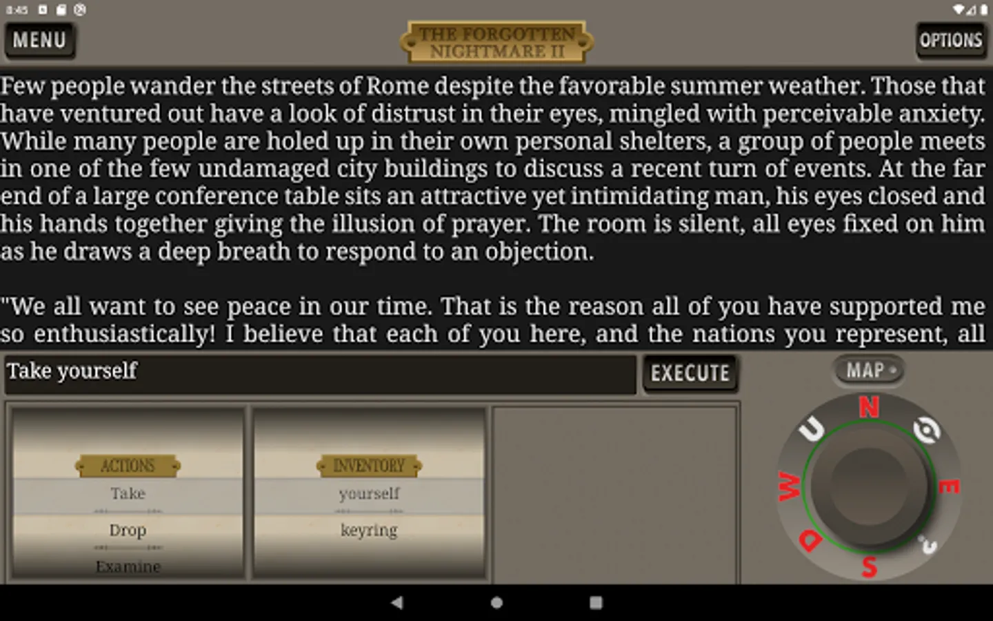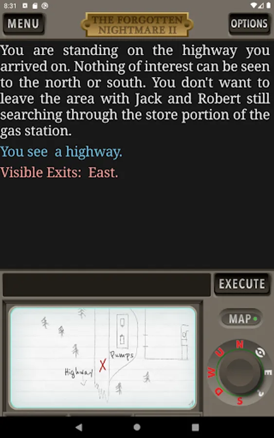 “The Forgotten Nightmare II: A New Reality” is the second chapter in a series of all text (Interactive Fiction) adventure games. Going against modern game evolution, the only graphics you will have is a map. It is a playable story which uses your imagination to paint the pictures. It is not simply a multiple choice game but has the ability to accept full commands with seemingly endless and often comical responses.