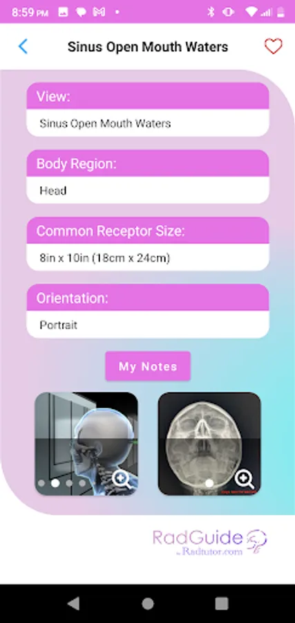 RadGuide provides 3D interactive radiography positioning info on on over 100 procedures. Supports English and Spanish. With your finger, rotate around a 3D x-ray room and patient with see through skin to easily visualize x-ray positioning and bones. Collimation, central ray positioning, necessary angles all provided for each procedure. Add your own notes and hints for each procedure so you remember your own techniques. Many years in development, there is nothing else like RadGuide.