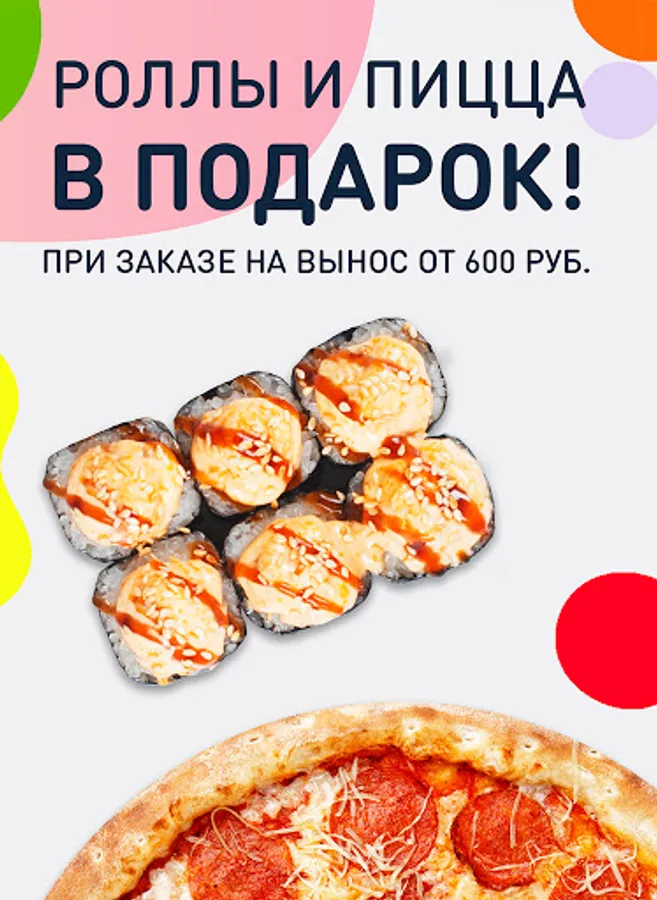 -With self-pickup from 650 rubles. roll or pizza for free!