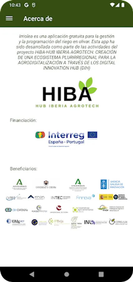 Irriolea is a free application for the management and programming of irrigation in olive groves. This app has been developed as part of the activities of the HIBA-HUB IBERIA AGROTECH project: Creation of a multi-regional ecosystem for agro-digitalization through the digital innovation hub (DIH).