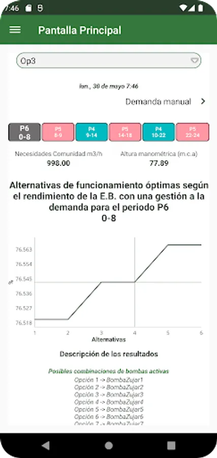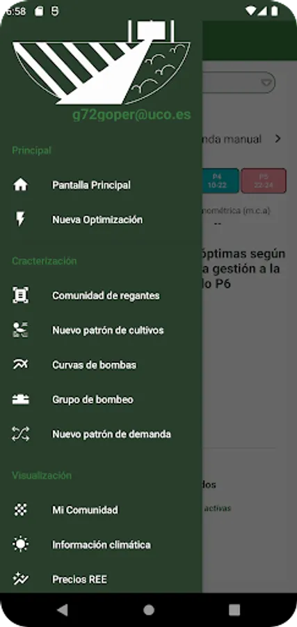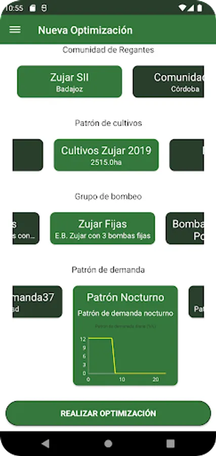 This application is designed to facilitate the decision-making process related to the management of pumping stations in an irrigation community. It allows managers to optimize the daily energy cost of the irrigation community and the evaluation of a large number of scenarios at the same time, having more information to make better decisions with zero investment. The optimization carried out by the application considers the new distribution of electricity tariff periods implemented in Spain as of June 1, 2021.