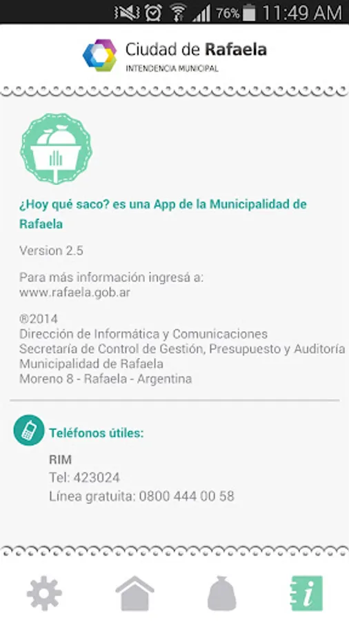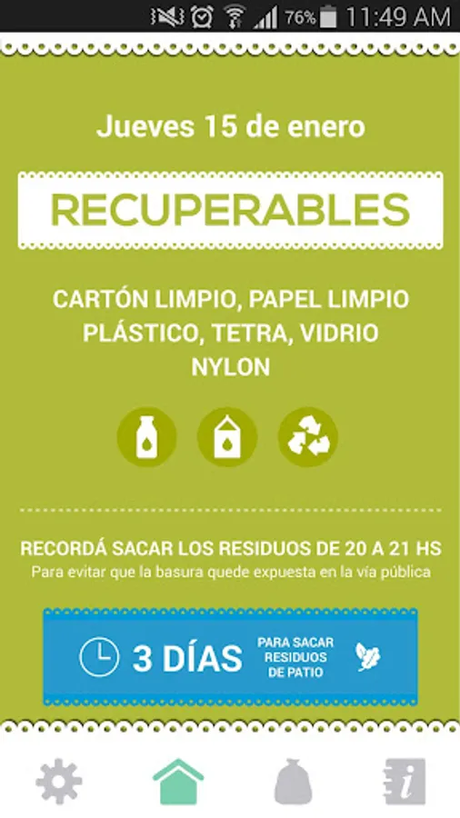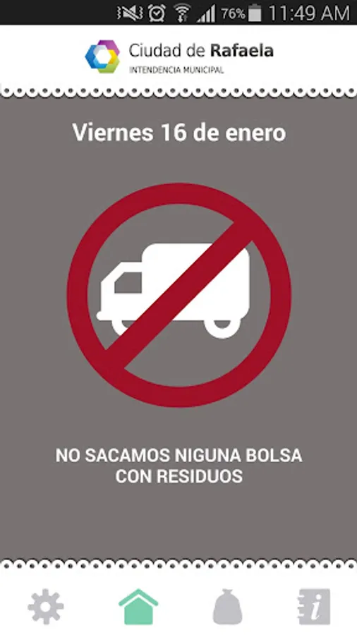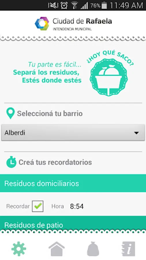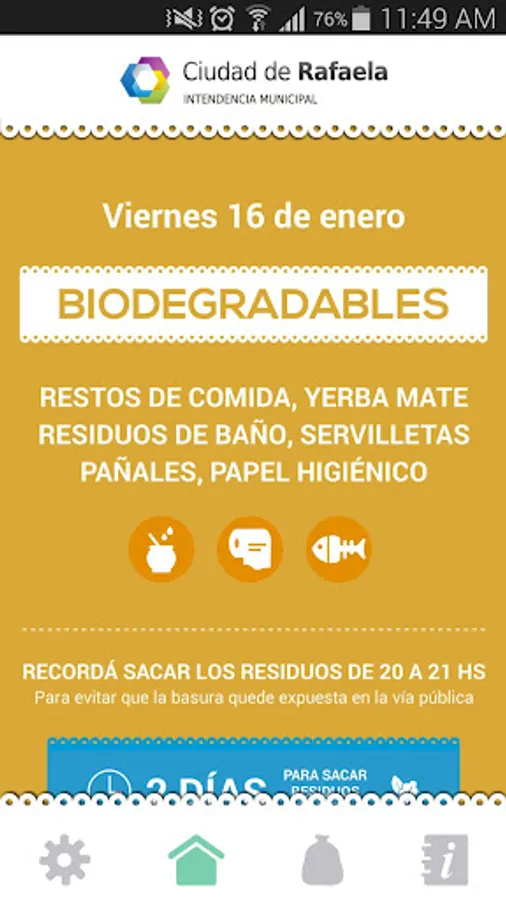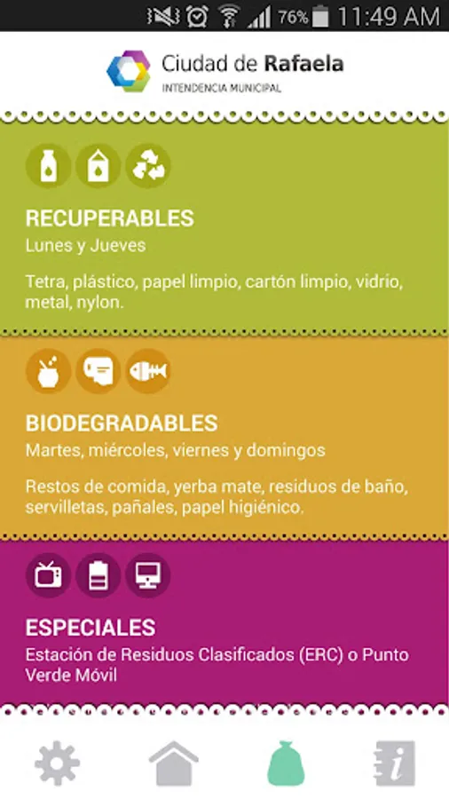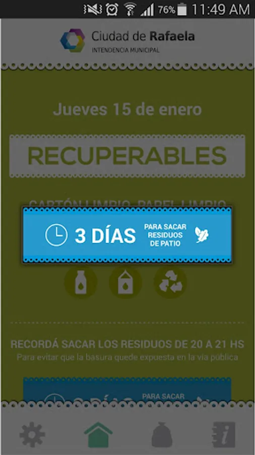 Developed for the City of Rafaela, this application will notify you daily what kind of garbage should take to the street and at what time.