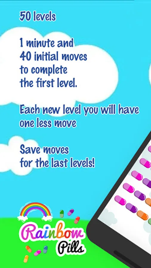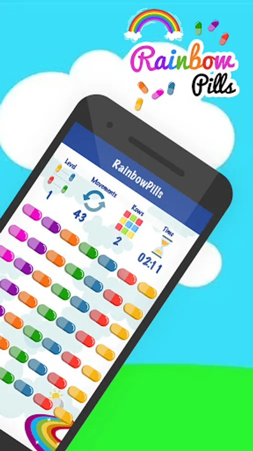 Our color puzzle game is very simple. You just have to form the 7 rows of pills with the 7 colors of the rainbow with as few moves as possible, because you will have to use the extra ones in the last levels of the puzzle!