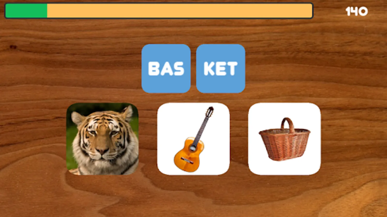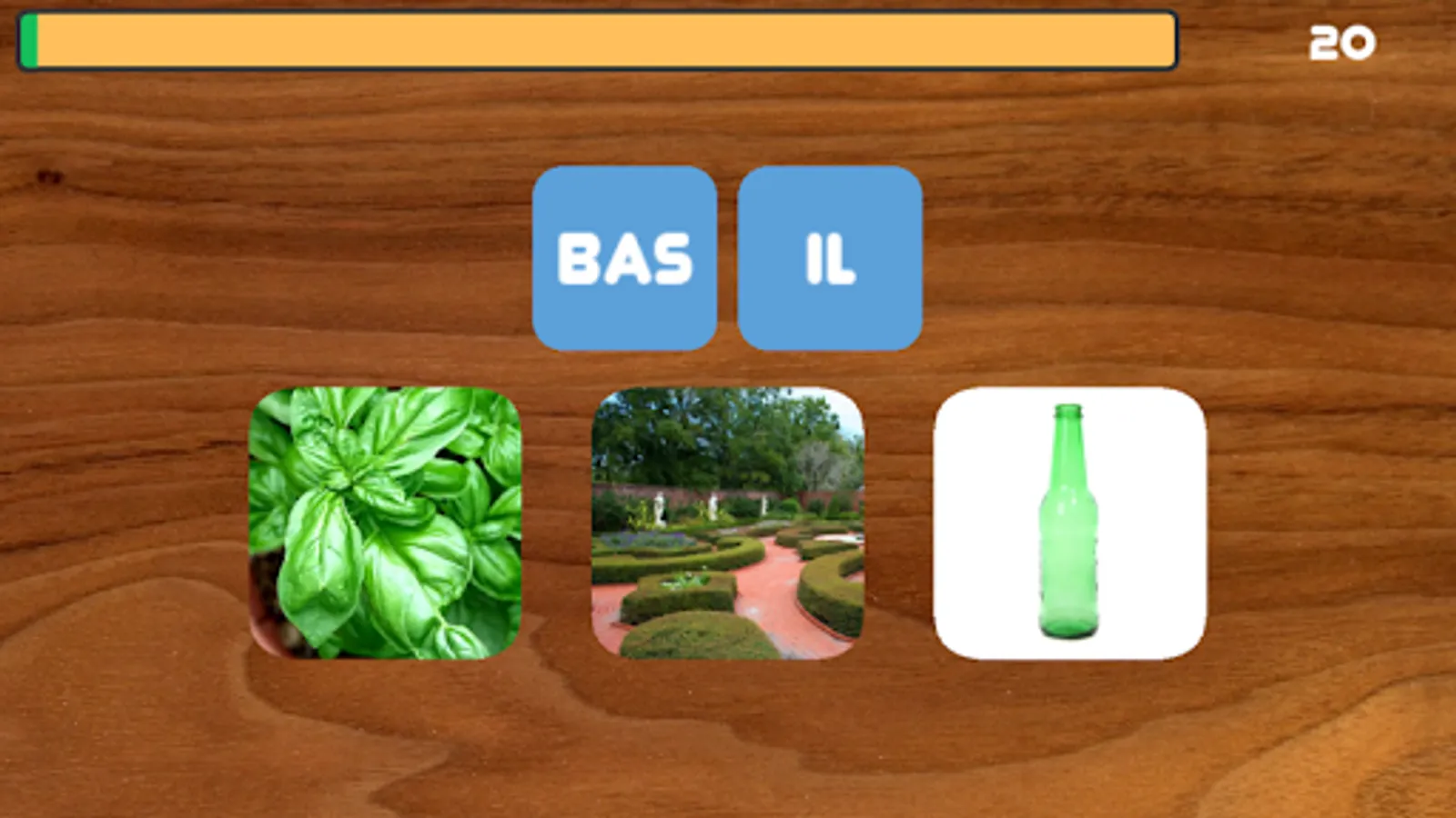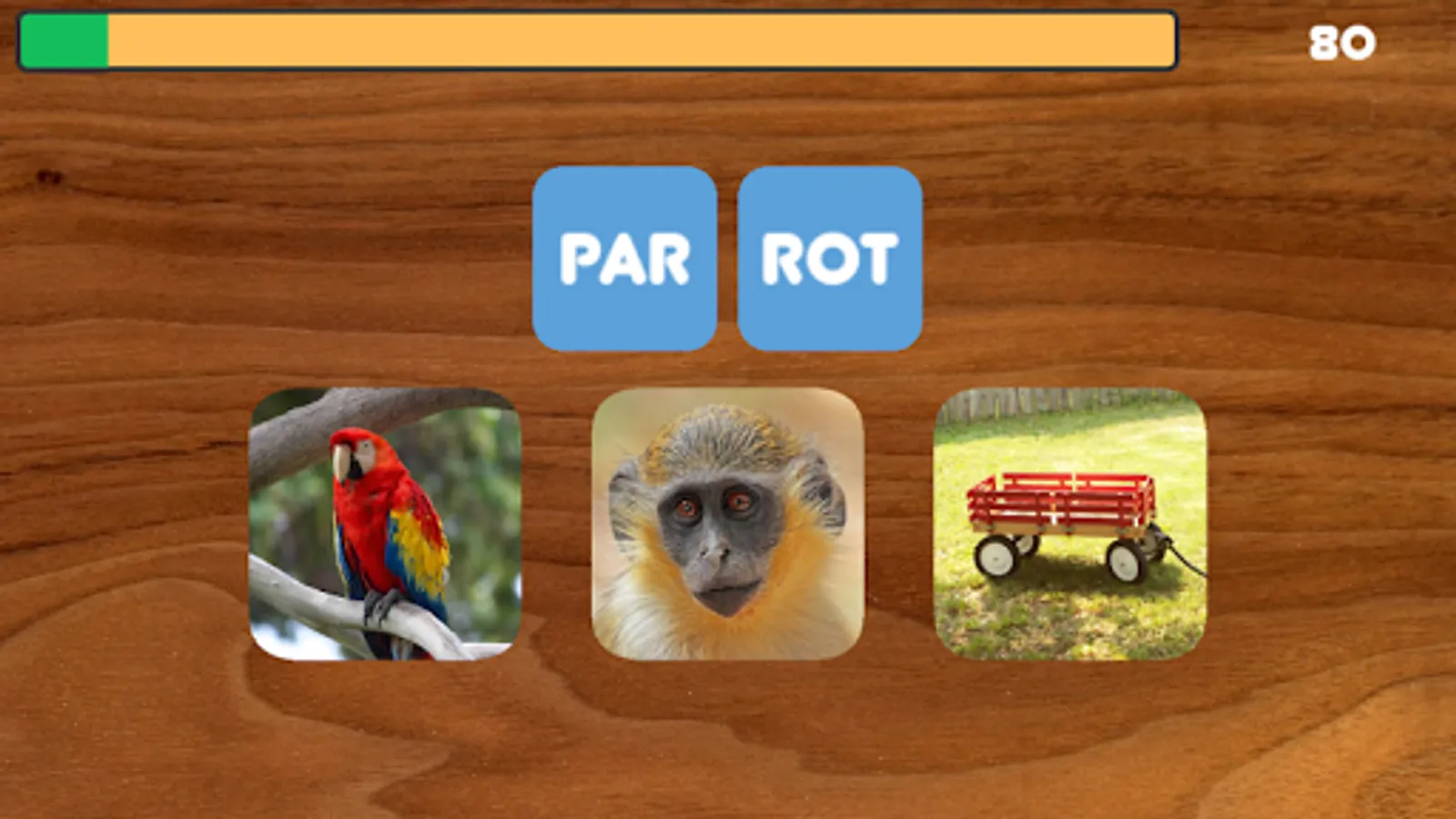 Read the word divided into syllables and select the corresponding image. When you select the right image you can move on to the next word.