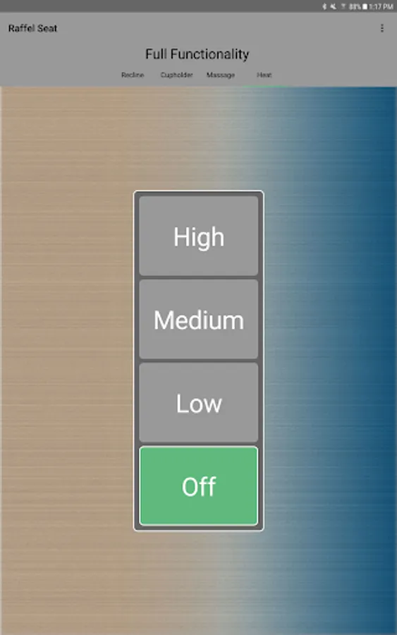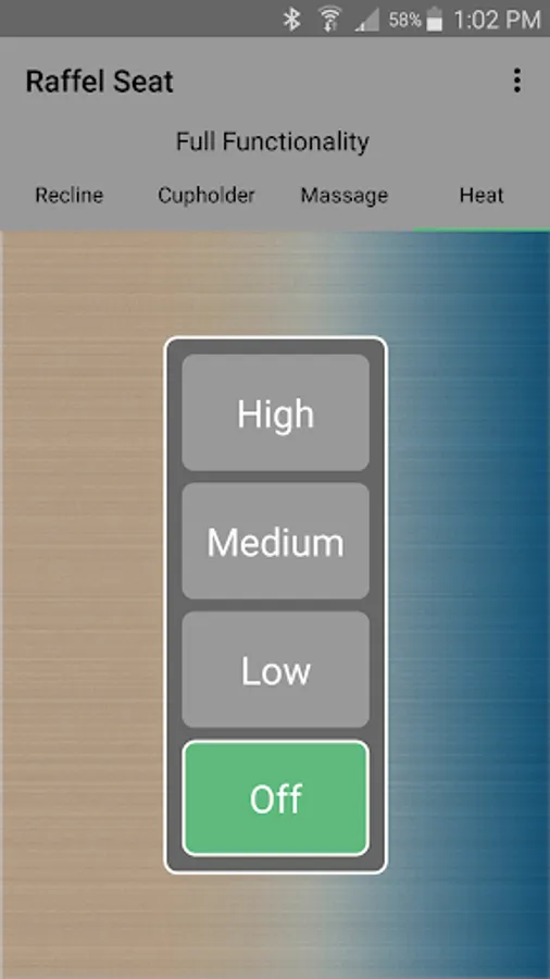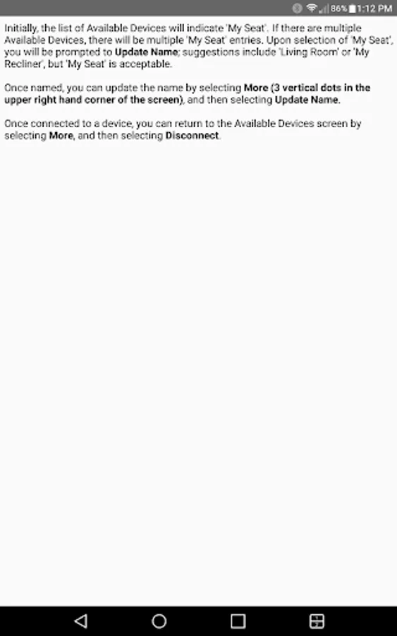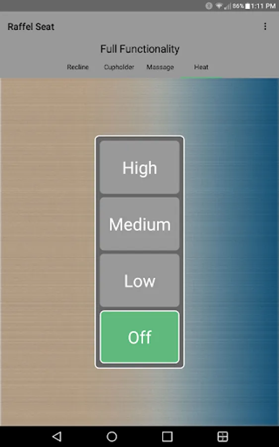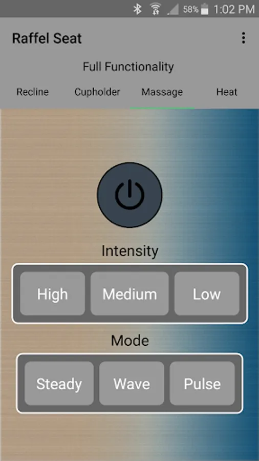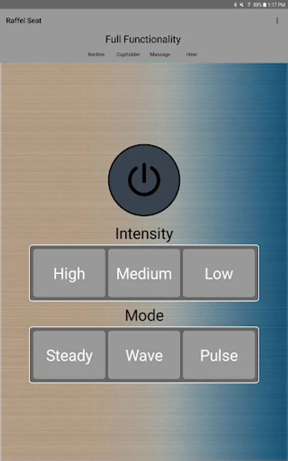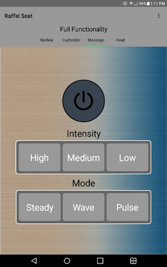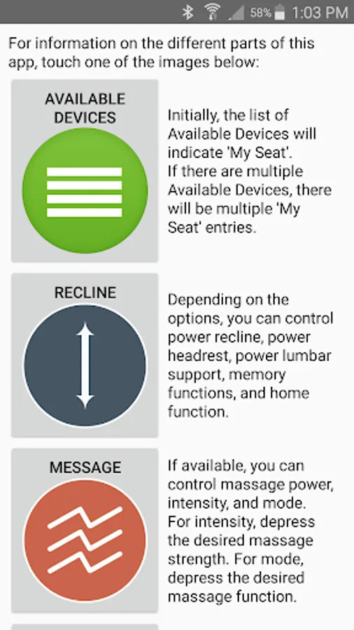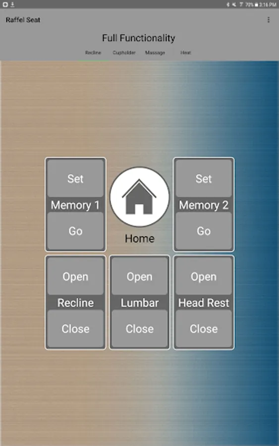 The app allows you to connect to your enabled furniture via Bluetooth from your phone or tablet. Depending on the options, you can control the electric motors that move your chair or sofa and may include power recline, power headrest, power lumbar support, memory functions, home function, light, cooling cup, heat, and massage.