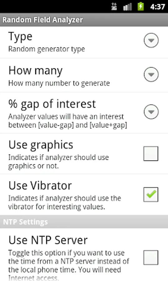 For each mode, using the preferences, you can change the type of random generator you want to use as well as other parameters such as the number of digits drawn and statistical percentage that seems to bring out the changes in Field.