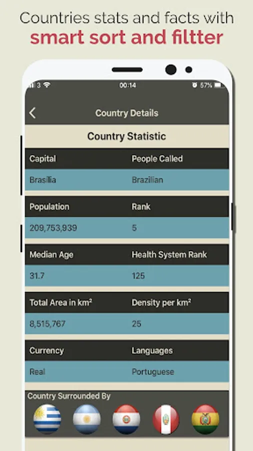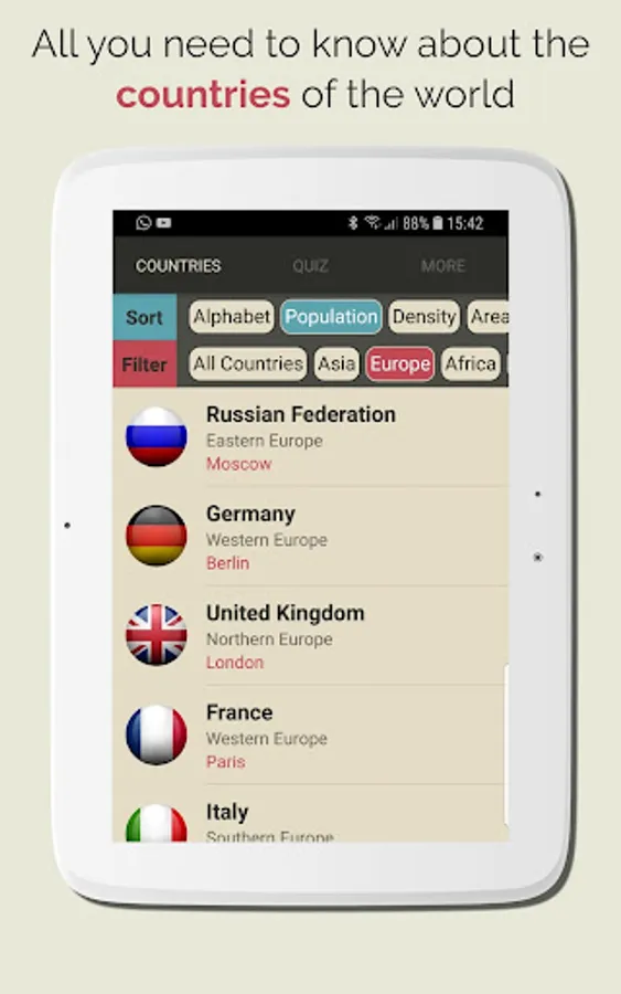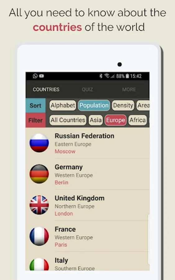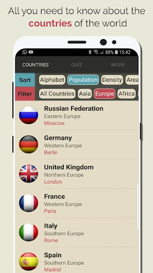 The App has smart sort system that allow you to cross filter for example you can sort all country list by population and the cross filter by region.