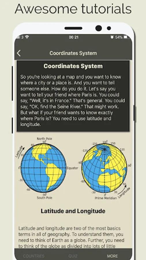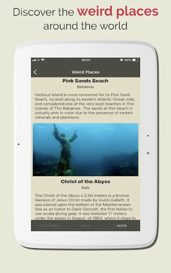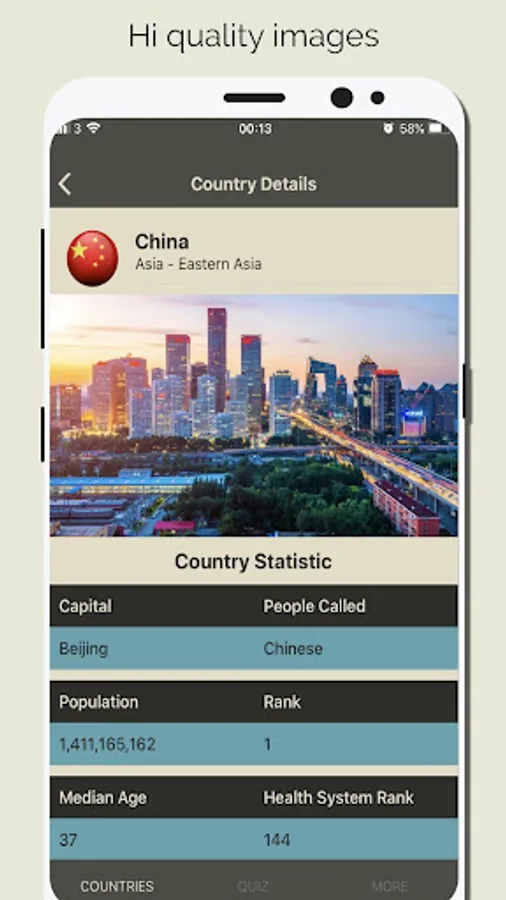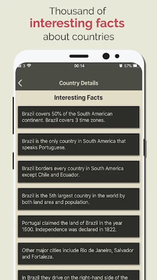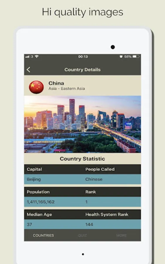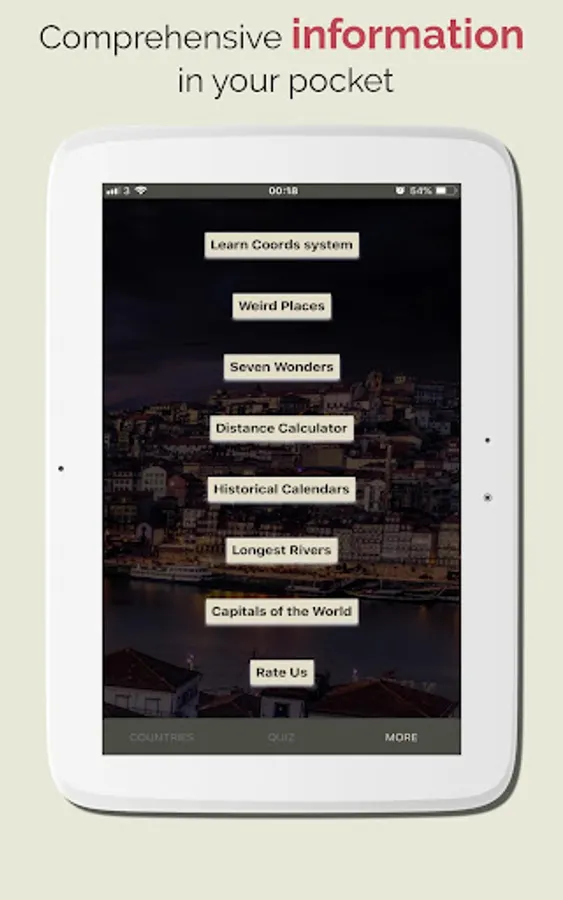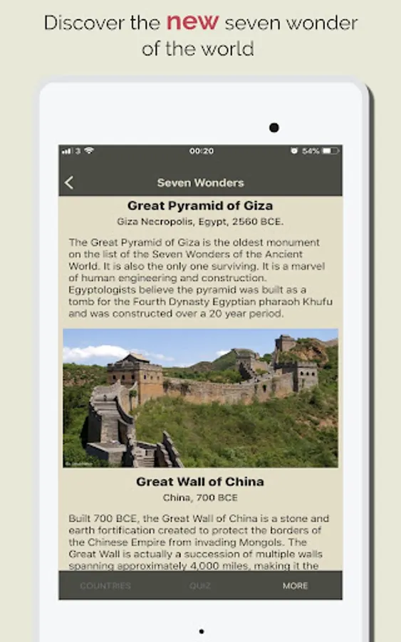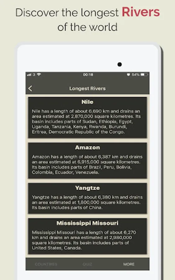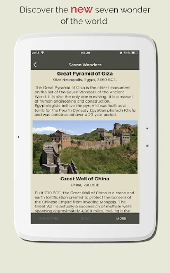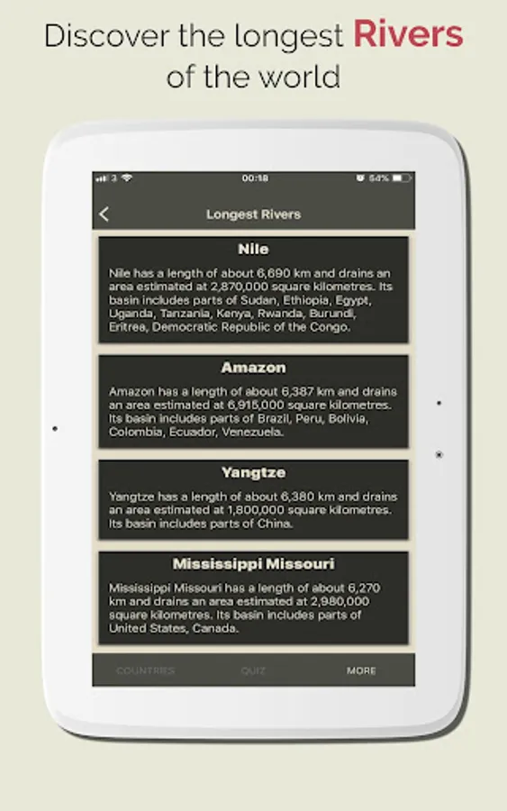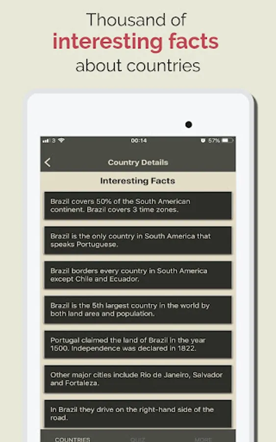 Discover Countries also provides Hi quality images, the App also has a Geo Quiz Game with thousands of question which are help you to quick learn and memorize the information. with the quiz game yo can