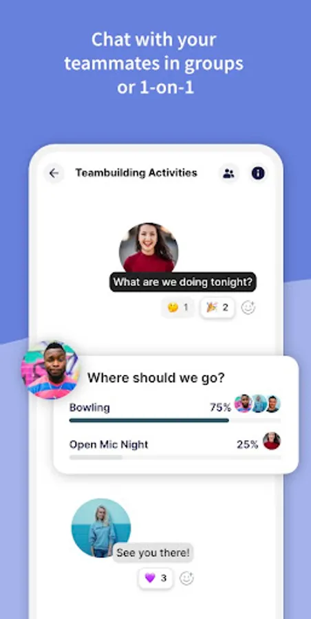 • We build community and culture with live chat, private groups, polls, team bonding activities, and more