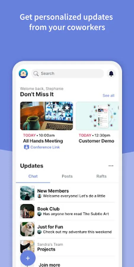 • We can find important information related to onboarding, HR processes, and product updates quickly in a centralized feed
