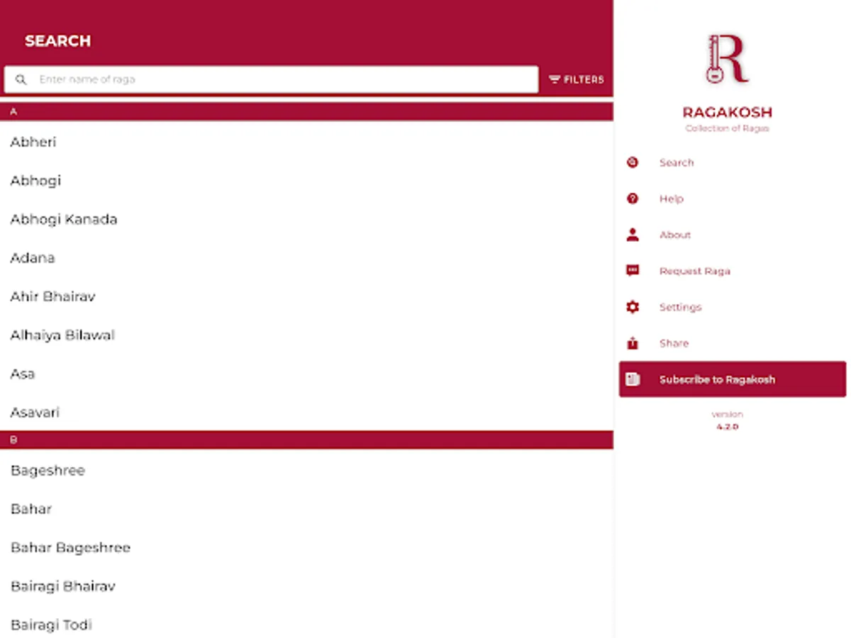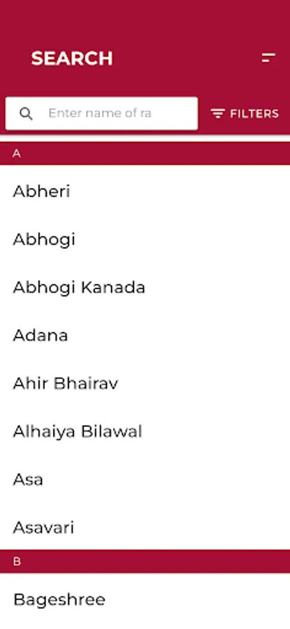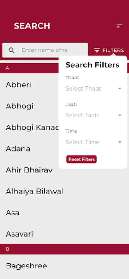 Search Filters: Filters by name, thaat, jaati, time.