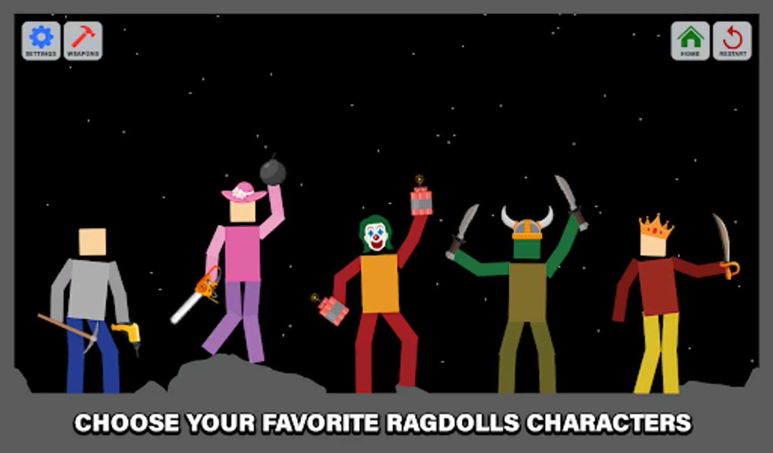 - Brand new Game with cool colorful graphics and realistic Ragdoll physics.