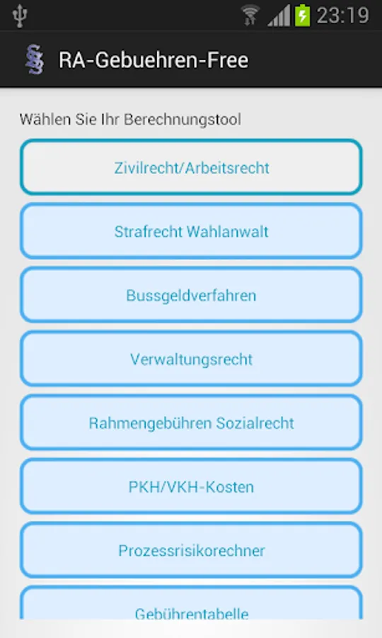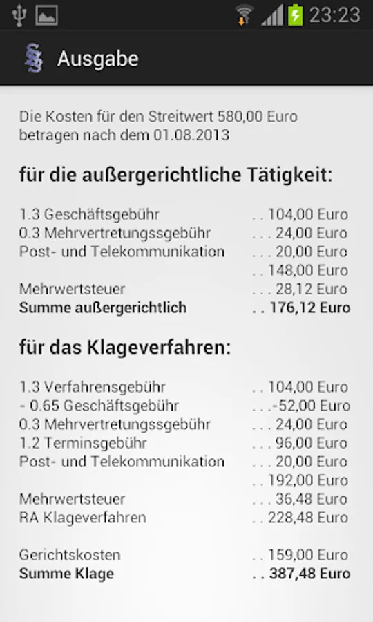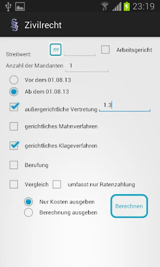 The app is a court and lawyer cost calculator for civil matters (district court, regional court, labor court) taking into account the value of the dispute and the status of the proceedings (pre-judicial, first and second instance, as well as settlement). The calculation according to the RVG or the court costs is made either in the version before August 1, 2013 or afterwards.