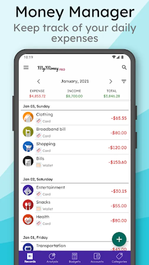 MyMoney is a personal finance management & budgeting app that helps you track your money use. This powerful spending tracker saves your money as you can see where your money goes. It has daily expense tracker, free budget planner, intuitive analysis and many powerful features-everything is offline, no internet needed. Use it for some days and you will see the differences.