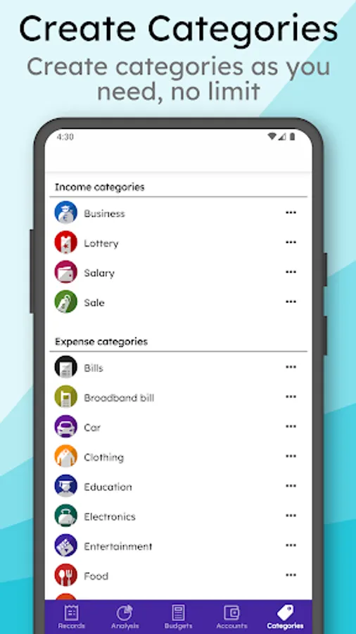 Manage income and expenses by categories (Cars, Foods, Clothing etc.). Create categories as many as you need.