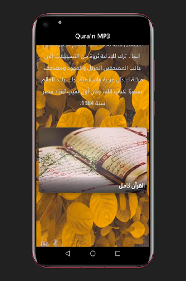 اذا كنت تبحث عن تطبيق للاستماع الى سور القرآن الكريم كامل دون اي تشويش او انقطاع وبالجودة عالية الدقة والوضوح , نوفر لك تطبيق Qura'n MP3 , والذي نجمع فيه لكم جميع سور القرآن الكريم معروضه ويمكنك الاستماع اليها عبر فيديوهات من خلال اتصالك بالشبكة (اونلاين) , بالصوت العذب والذي تقشعر له الابدان , يتلوها افضل الشيوخ منهم , الشيخ السديسي , والشيخ مشاري العفاسي وياسر الدوسري واحمد العجمي , حيث يتلو سور منها سورة البقرة وال عمران ويس والصافات والنساء والكهف ويوسف وغيرها , حمل تطبيق Qura'n MP3 واستمع بكل خشوع