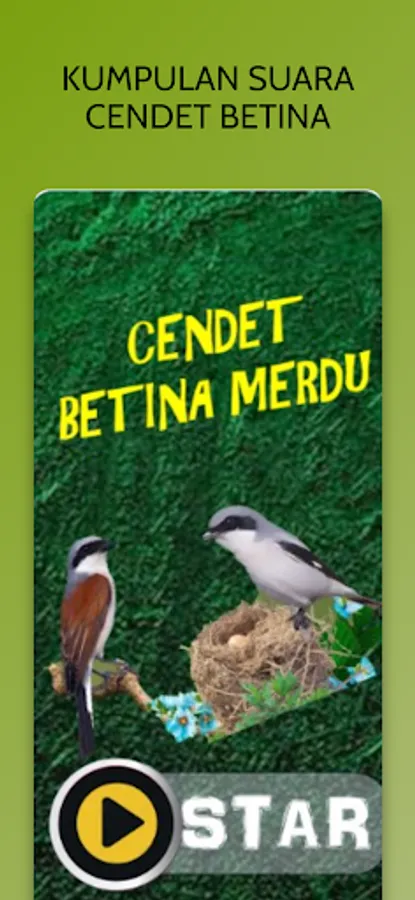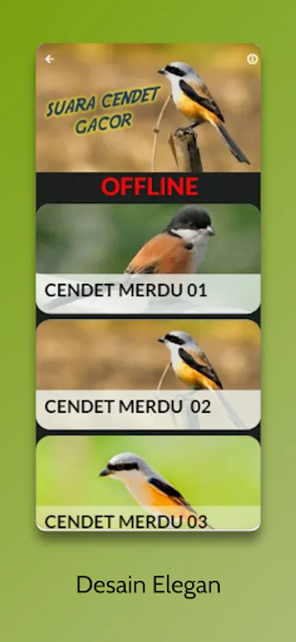 Are you a lover of shrews and want to listen to their melodious voices anytime and anywhere? The Saura Merdu Cendet Betina Offline application is the perfect solution for you. We present an application that provides the melodious chirping of female cendet birds offline, so you can enjoy the beauty of their voices without having to be connected to the internet.