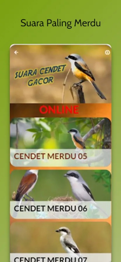 We understand your desire to hear the mesmerizing gacor chirping of your favorite cendet bird. This application contains various types of gacor chirps that will make your shrike more active and happy.