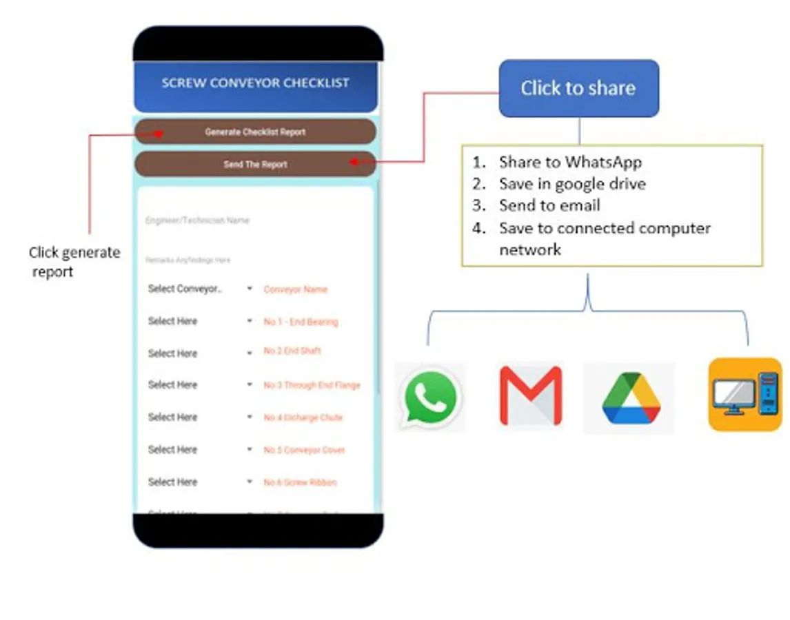 - You can send,save, and share workorder report to any mobile apps ( email/WhatsApp/google drive/ and many more )