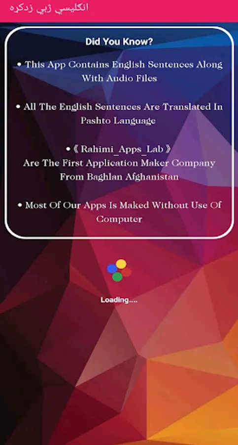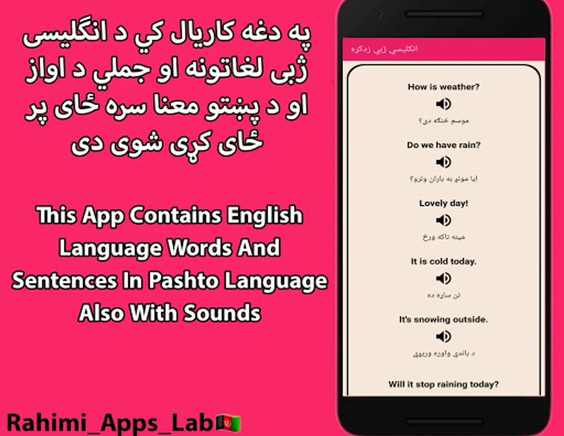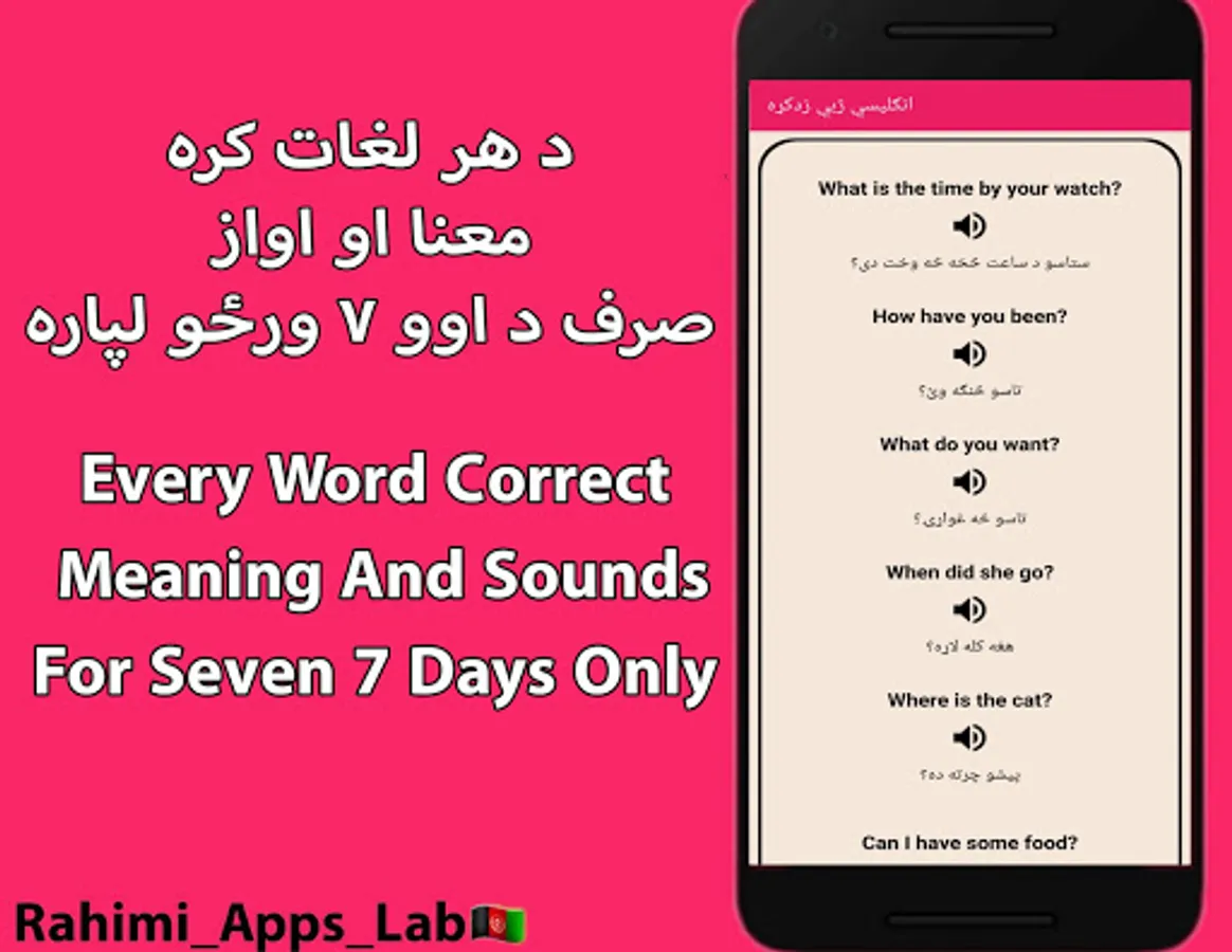 From this app you can learn english language words and sentences in pashto language with audio. This app works without internet from this app you can learn english in seven days only