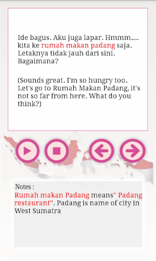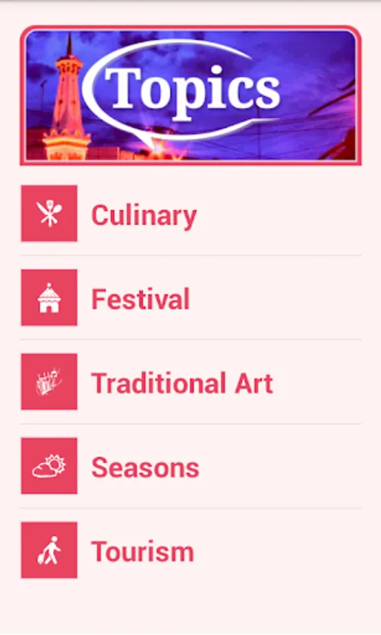 By using this app, foreign speakers learn not only Indonesian conversation skills, but Also get more information about Indonesian language and culture. There is a quiz in every topic to Evaluate the understanding of the learners.