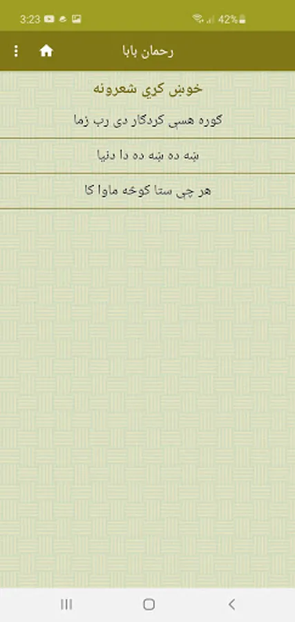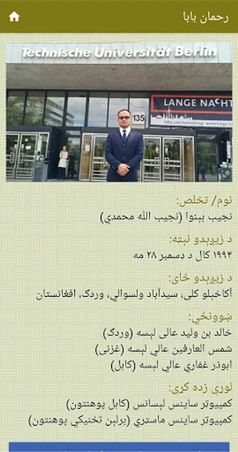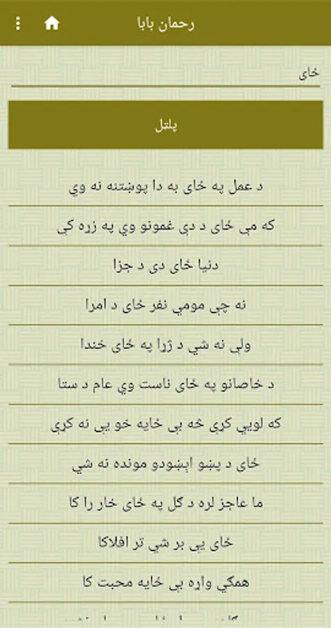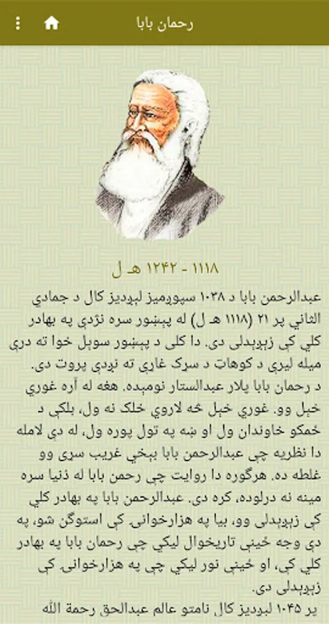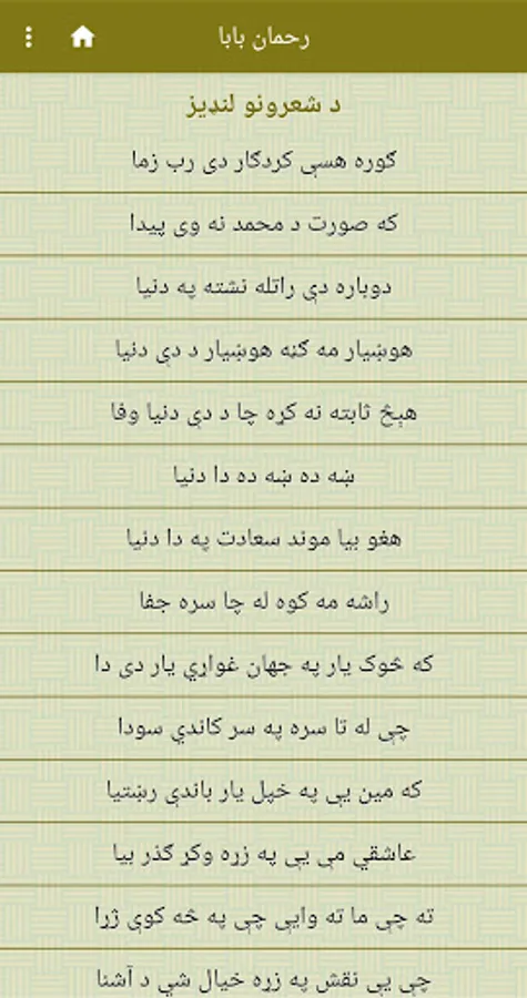 This app is about Abdul Rahman Baba's poetry. He is a Pashtun Sufi poet. The app is capable of indexing, searching for a keyword in the poems, personalizing poem listing and it has a brief biography of the great Poet.