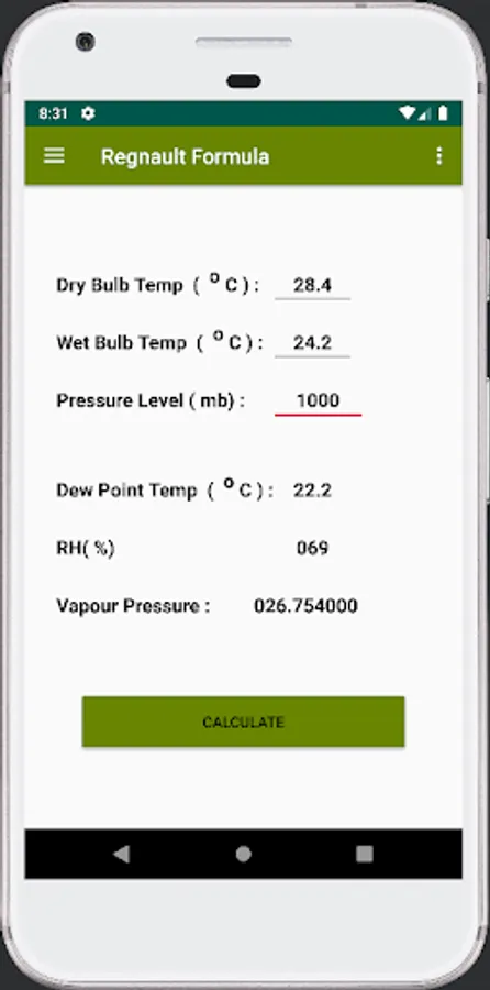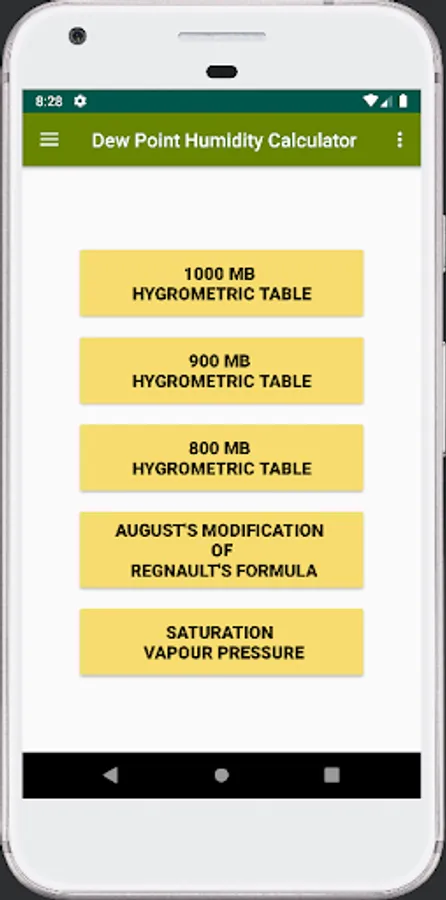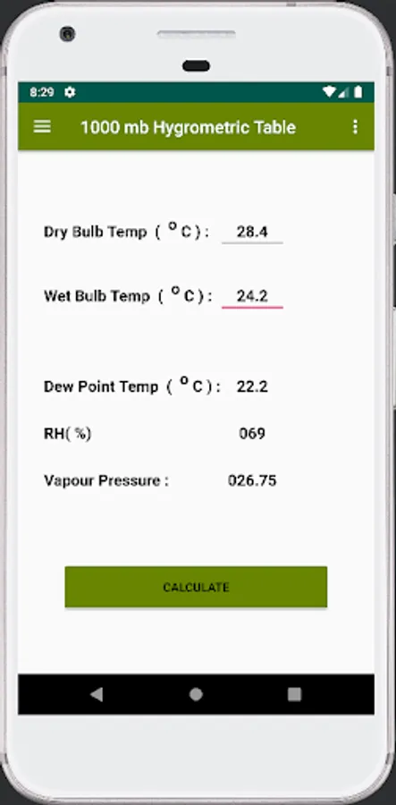 This app will help you to find dew point and Relative Humidity value from dry bulb and wet bulb temperature. It also help to find the vapour pressure of that dew point value.Now I used 1000mb, 900mb and 800 mb Hygrometric table. Later I will update 700 mb Hygrometric table data.