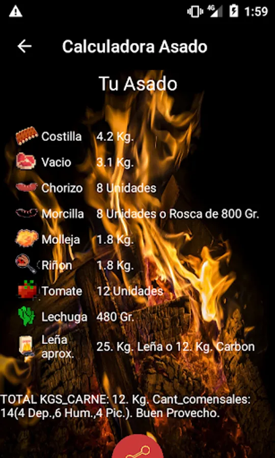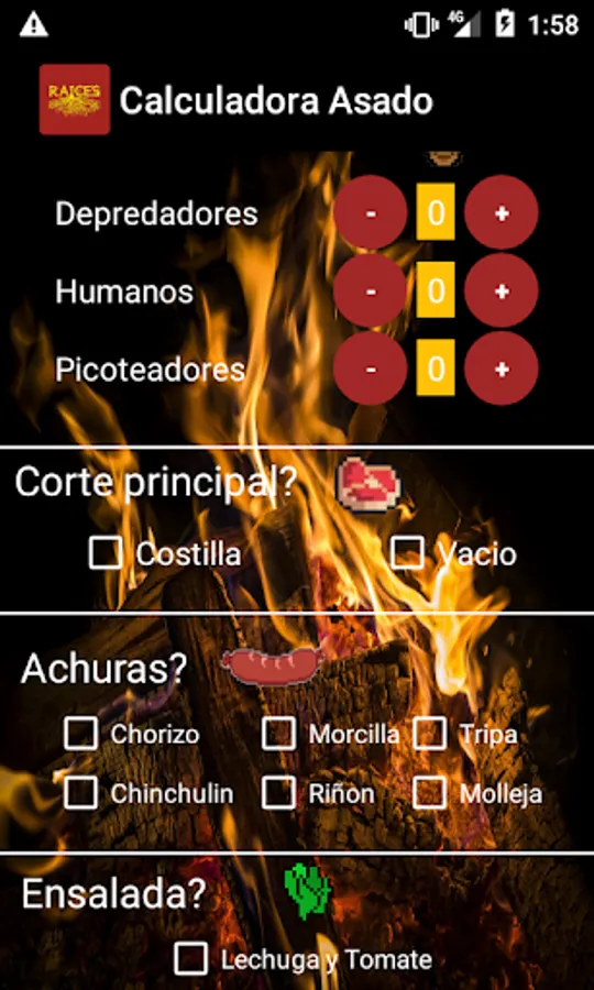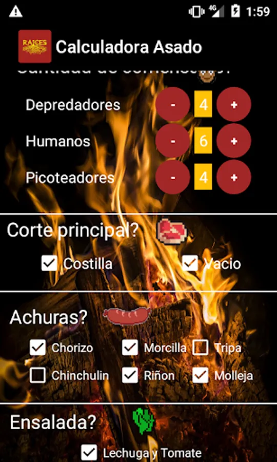 Calculate the amount of meat and achuras of a roast for several people with different levels of appetite.