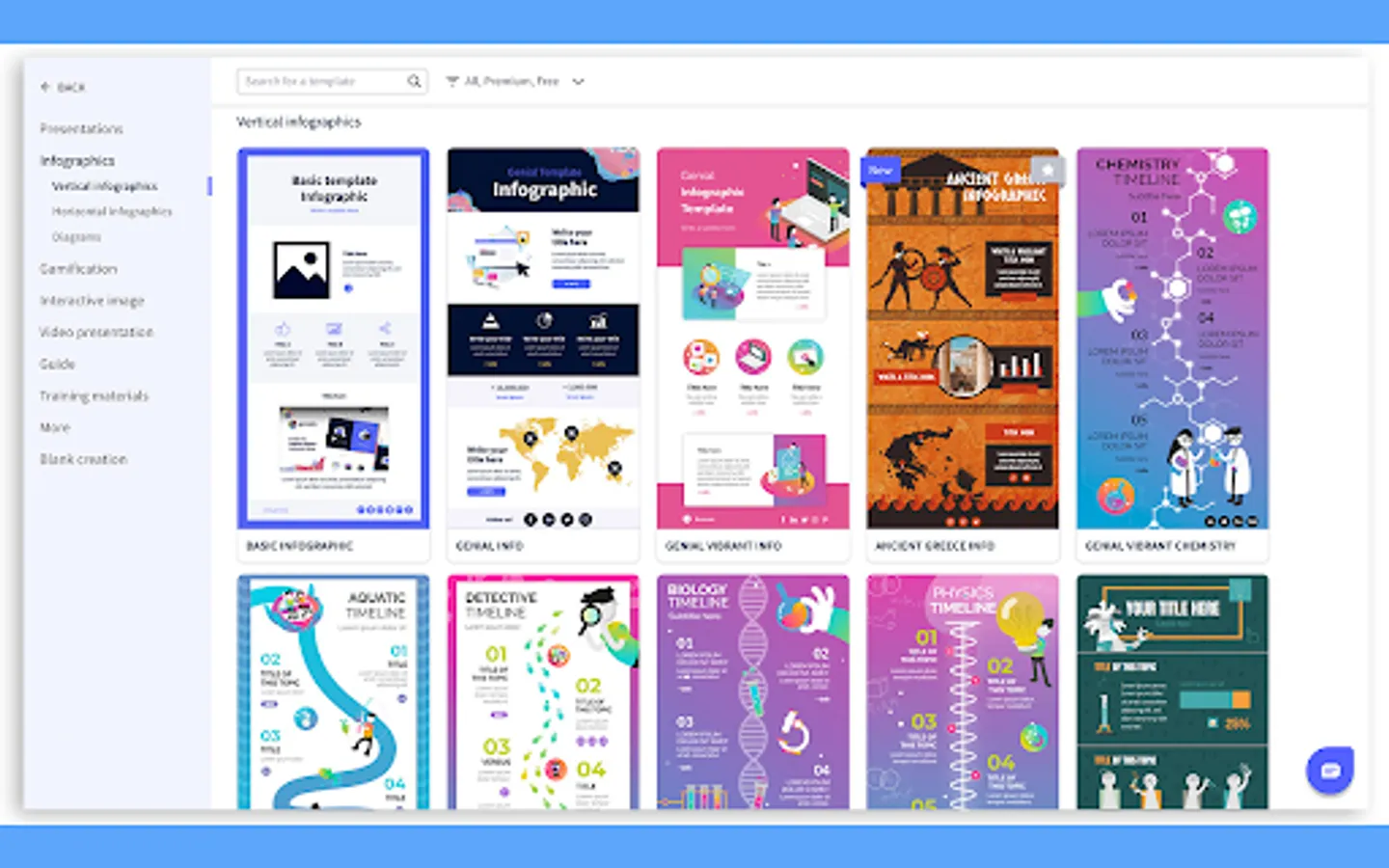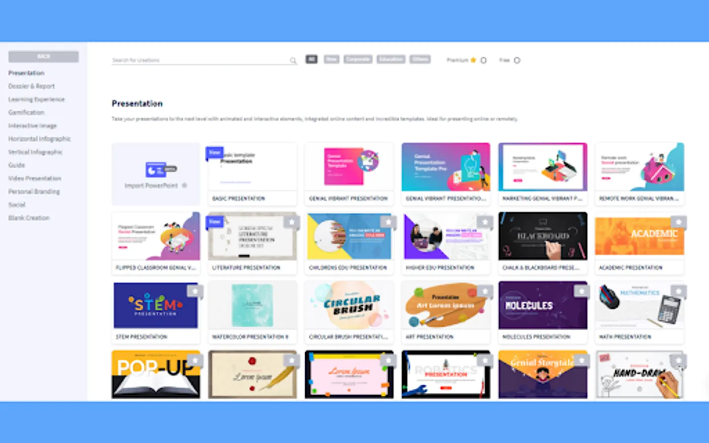 Genially offers more than 1100 templates in 5 distinct categories – Presentations, Infographics, Gamification, Interactive images, and Video presentation.