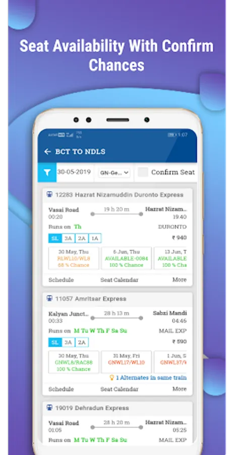 availability along with confirm chances and alternatives, Seat availability calendar, Trains by station, Fare