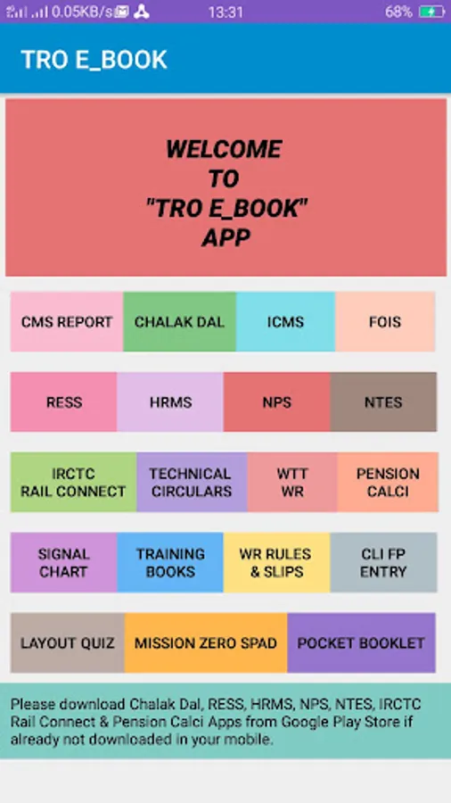 This is a platform where an Indian Railway Employee can approach for that very small information like booking in trains, PNR Enquiry, IRCTC Exclusives etc through “IRCTC Rail Connect”, Spotting your Train, Live Station, Train Schedule, Train b/w the stations, Cancelled Trains, Rescheduled Trains, Diverted Trains in “NTES”, Searched related National Pension System i.e. “NPS”, also calculate your pension through “Pension Calci”, salary pay slips, Income Tax details, Loans & Advances, PF withdrawal, Retirement Benefits, Leave info. etc through “RESS”, Loco failures related data like Asset Failures, Punctuality Performance, Repercussions of Trains, PAM etc through “ICMS”, you can also apply and download your e-pass and PTO through “HRMS”, through “Chalak Dal” LPs/ALPs/Shunters/Guards can sign on and sign off, report abnormality, access quiz, view current technical circular and current month safety monthly rule & bulletin and various options available like crew bio-data, training details, loco competency, road learning, mileage, overtime details, TA booking, crew availability, train (freight) searches, through “CMS Report” an individual can login and find all the necessary information of LPs/ALPs/Shunters/Guards like working hours, crew utilization, crew current position chart fetching as per rule and many more. All the Technical Circulars of Electrical TRO department of WR Zone you can find through “Technical Circulars” option, All the WTT’s of WR you will get through “WTT” option, by clicking on “Signal Chart” option you will get Signal Chart Books of ADI, BRC, RTM & MMCT division, all the study materials for LPs & ALPs like UDZ Training School Books, BRC Training School Books, 3-Ф MEMU Book & WAG-12 Book through “Training Books” option. Through “e-locos TSD” App option you will find all TSD’s, equipment locations, loco circuits simplified, loco checking, test procedures, safety instructions and various operations. By clicking on “Gyan Darpan” App button you will get all the objective and subjective questions related to locomotives. Through “WR Rule Books” you will get all the Rule Books like G & SR, Operating Manual, Accident Manual, Correction Slips, Amendments, Discipline and Appeals. I hope the above mentioned information is sufficient for you all about this app. Please note that the mentioned apps (Chalak Dal, RESS, HRMS, NPS, NTES, IRCTC Rail Connect, Pension Calci, WR Rule Books, e-Locos TSD & Gyan Darpan) will not open if already not downloaded in your mobile.