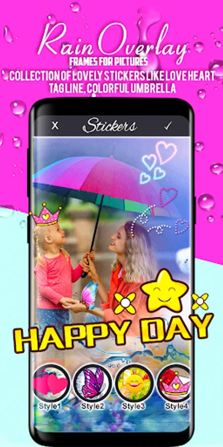 When the sky usually rains in winter we all start feel Goosebumps and inspired by its sound and its smell and some of us also love take picture for it or take picture for himself while it’s raining , now with Rain overlay photo editor you can bring rain motion to your picture whenever and wherever you are , use this application to decorate your picture with rain frames and get a perfect natural look , actually Overlay Rain photo editor allows you to use a cool collection of stickers like Heart Crown , Colorful flower crown stickers , and also you will benefit from a massive bundle of animal stickers such as : Rabbit – Panda – Doggy – Cat – Pig … , moreover in Rain overlay you can use some love stickers and umbrella stickers to make some wonderful pictures .