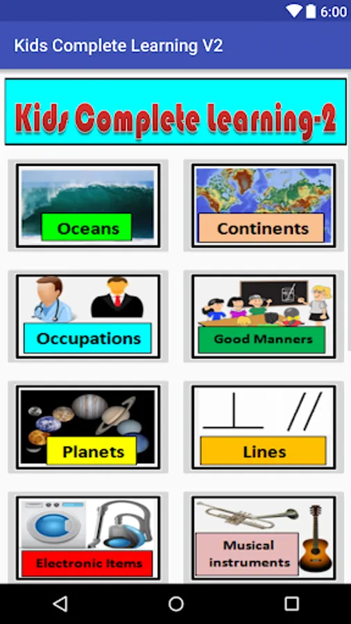 KIDS Learning App is intended for babies,toddlers,pre-nursery as well as Post-Nursery Kids. It will help kids to gain knowledge with simplified User Interface with real life images and innocent voice.