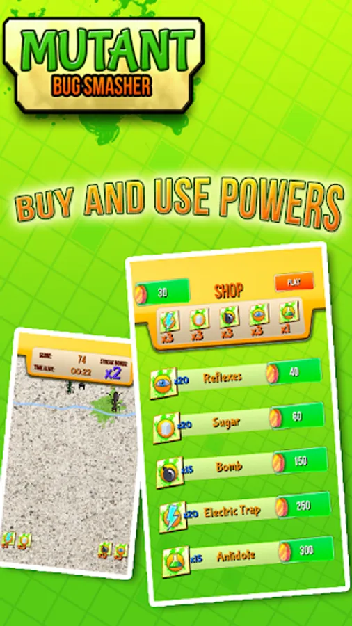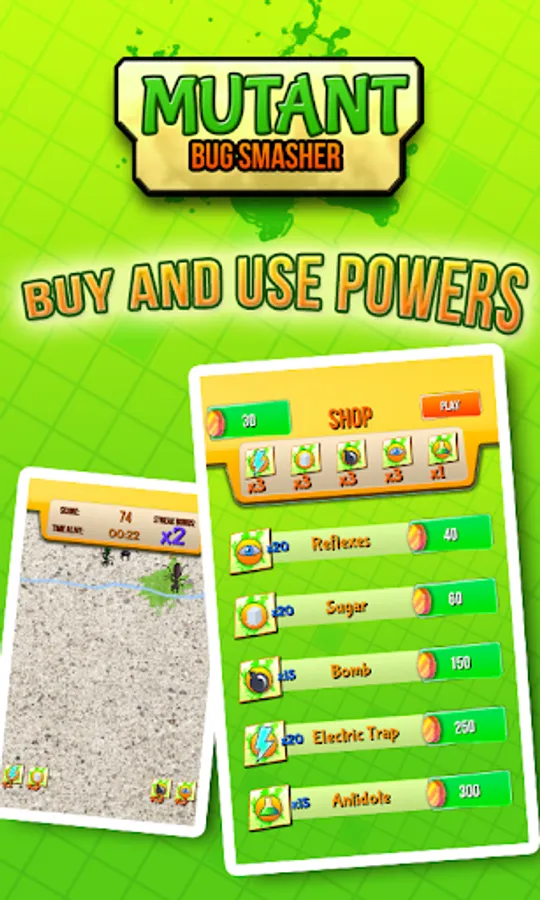 Use power ups to increase your records & compete with friends to get to the top by smashing ants, bees, termites, scorpions, flies, and new sort of bugs comming from the desert the amazon or the jungle, there are also big titan bugs. This titans are harder to kill.