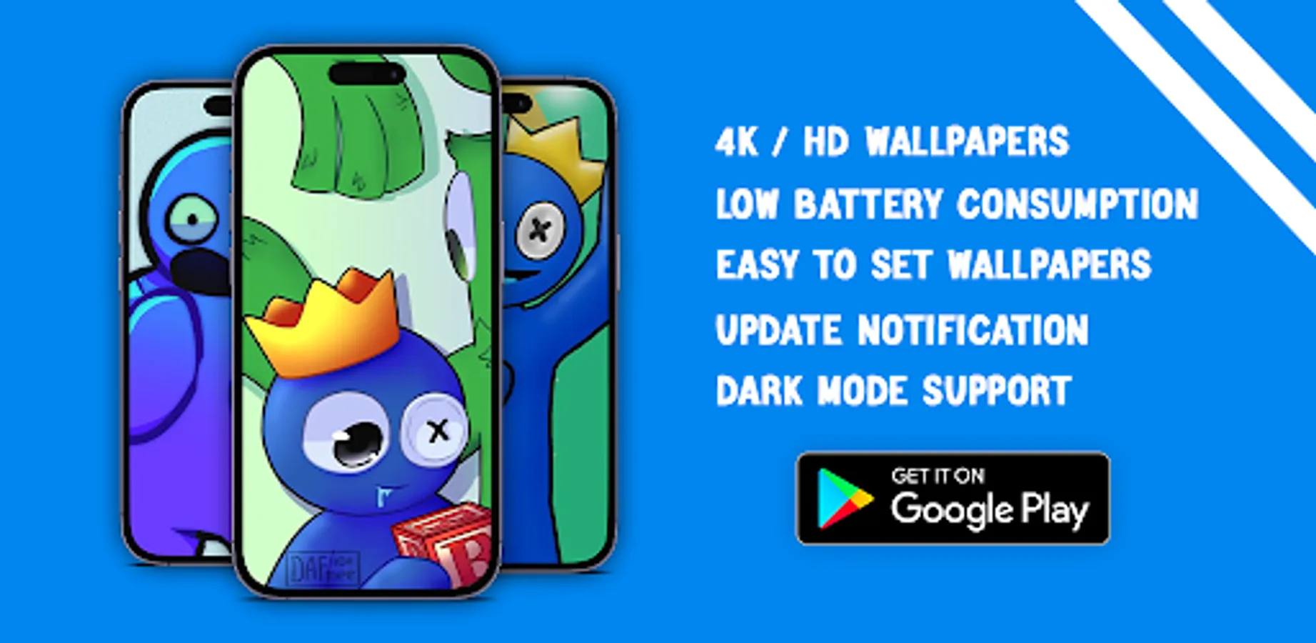 The Rainbow Friends Blue Wallpapers Application Has Many Features, The First of Which is Low Battery Consumption, High Quality Images, and Easy to Set Wallpapers on Your Phone, and You Can Save The Wallpapers in Your Device and Share Them With Your Friends, Support Dark Mode, Update Notification