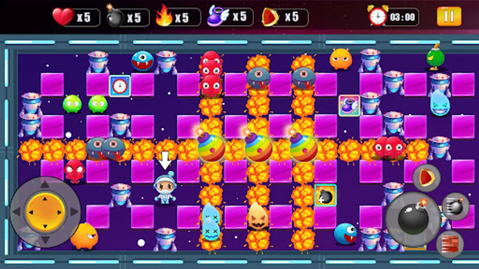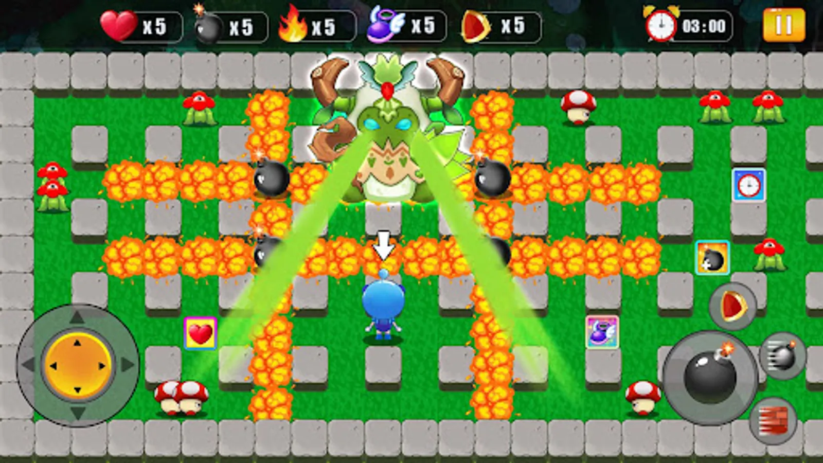 🔹 Earn boosters and blast the monster with variety of items to improve your strength: bomb-up, speed shoe, soft block pass, shield vest, and extra live….