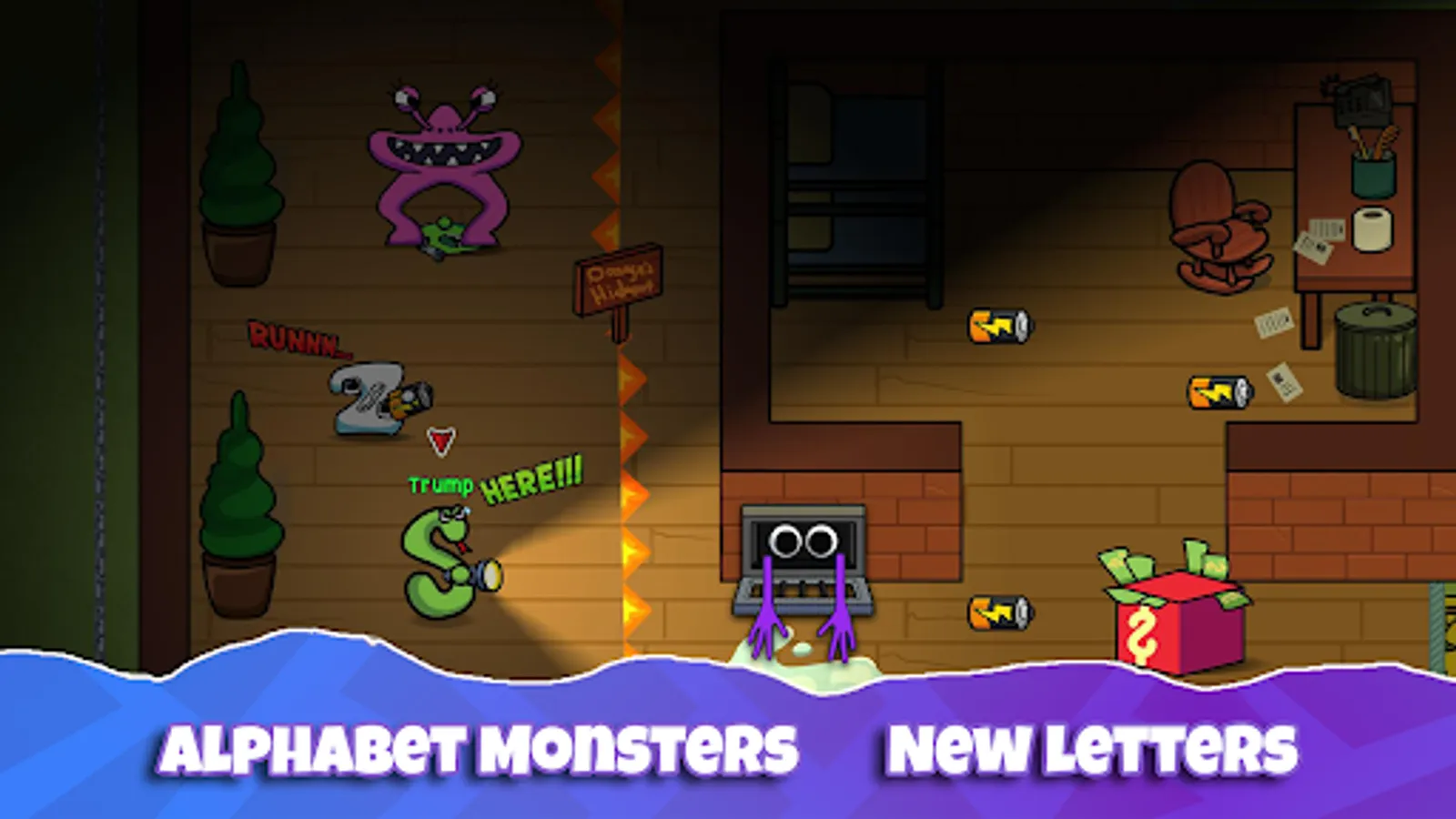 - Tap the “box” button to hide from the alphabet monsters