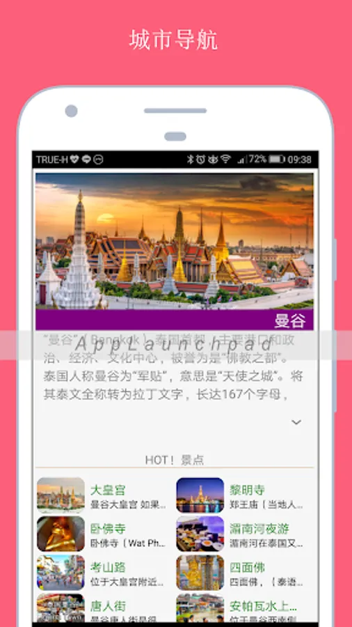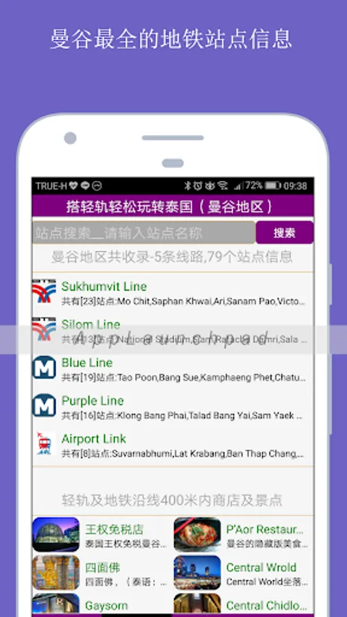 包含曼谷大量景点、商店及最全的轻轨和地铁坐标,可导航精确到每个站点及周边。软件涵盖曼谷周边(大城府、丹嫩水上市场、考艾、华欣)、清迈,芭堤雅,普吉岛,苏梅岛等大部分景点、商店信息以供参考。