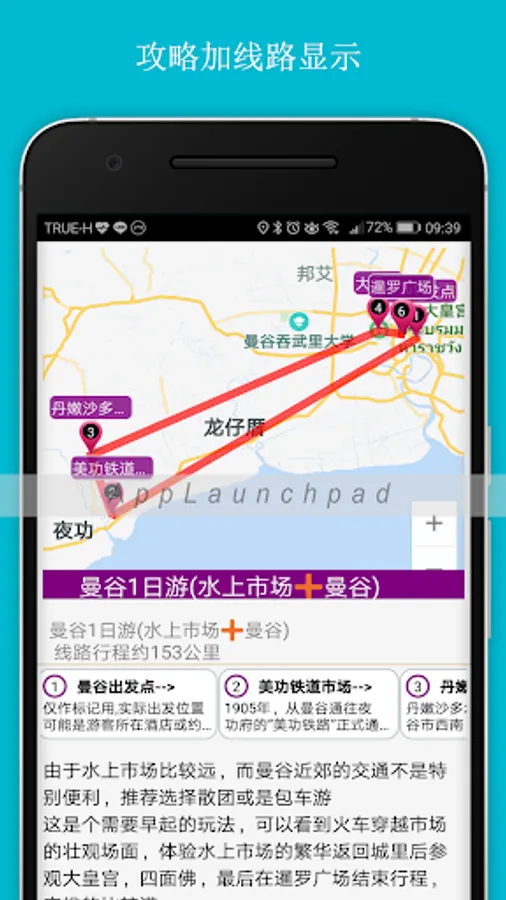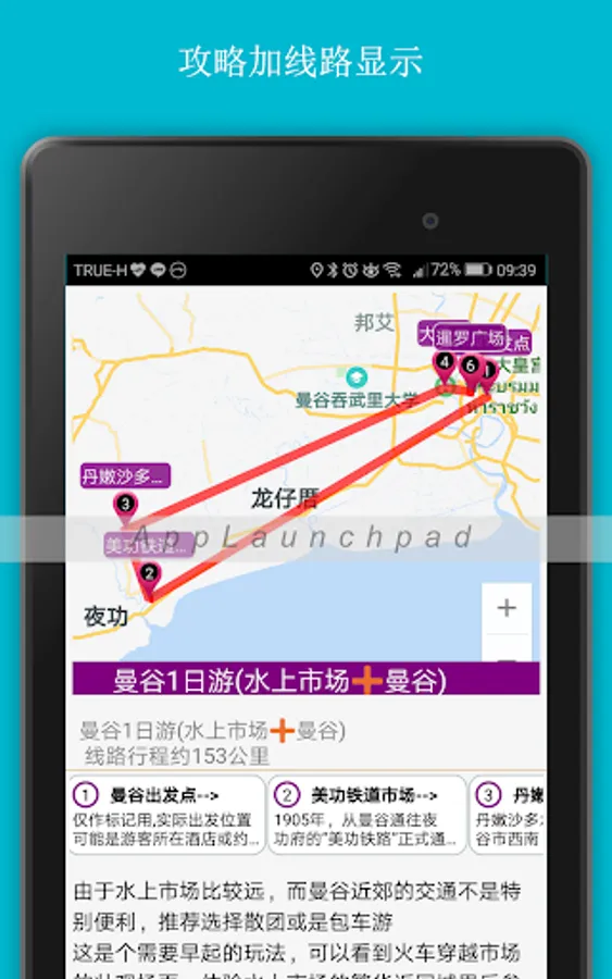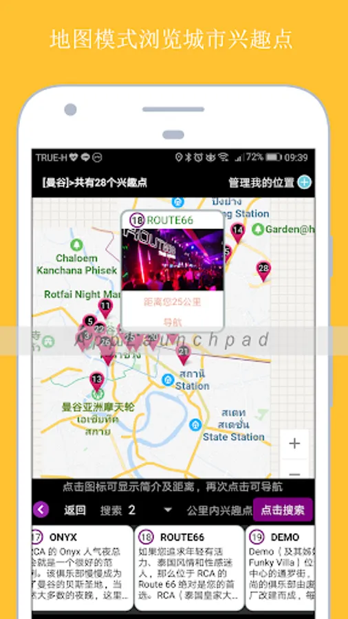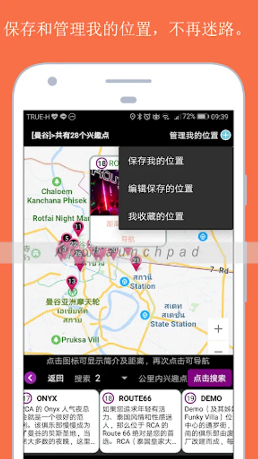 由于GPS定位会有一定的偏差,尤其在室内时,使用基站定位误差会较大,请一定以实际位置为准。如有坐标及商业信息有误,请及时反馈给开发者。 包含曼谷大量景点,最全的轻轨和地铁坐标,可导航精确到每个站点信息及周边。软件涵盖曼谷周边(大城府、丹嫩水上市场)、清迈,芭堤雅,普吉岛,苏梅岛等大部分必玩景点