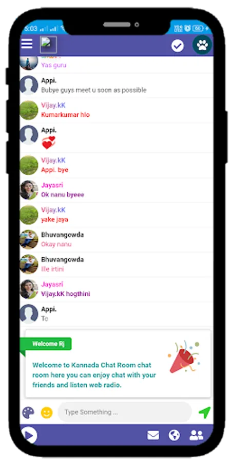 Kannada chat room has lots of fun while chatting. People can talk about a particular topic, anyone can join the discussion and knowledge-based group chats people can learn other's mentality. We have provided attractive group chat with good design features and also have a private chat.