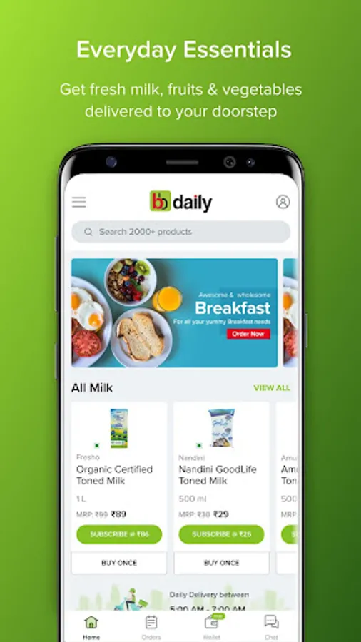 Start fresh every day with bbdaily A TATA Enterprise. With bbdaily, Subscribe to fresh milk and groceries and get it home delivered with an easy subscription choice. bbdaily has a presence across 18 key Indian cities of Ahmedabad, Bangalore, Chennai, Delhi, Gurgaon, Hyderabad, Kolkata, Mumbai, Noida & Pune, Lucknow, Kanpur, Vishakhapatnam, Vijayawada Guntur, Chandigarh Tricity, Patna, Indore, Kochi. Download the bbdaily app, recharge the wallet, and start shopping now.