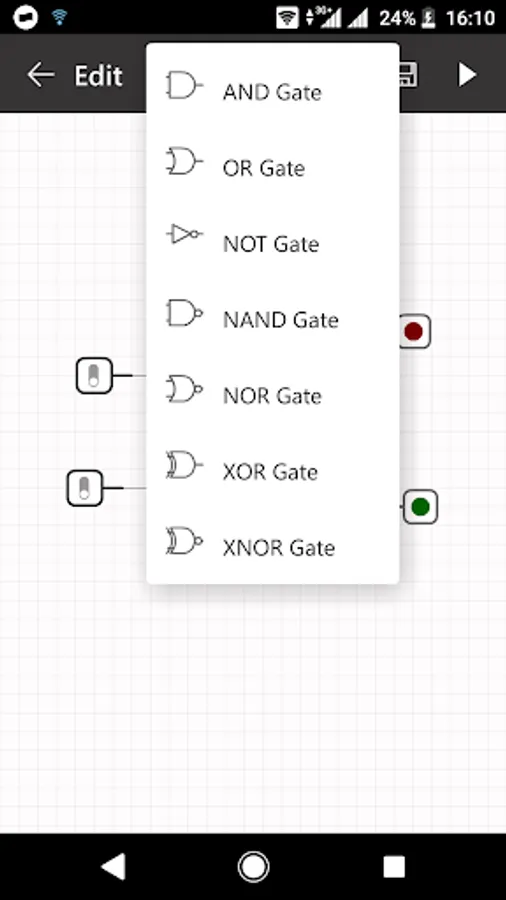 - Logic gates (AND,OR,NAND,NOT,NOR,XOR,XNOR)
